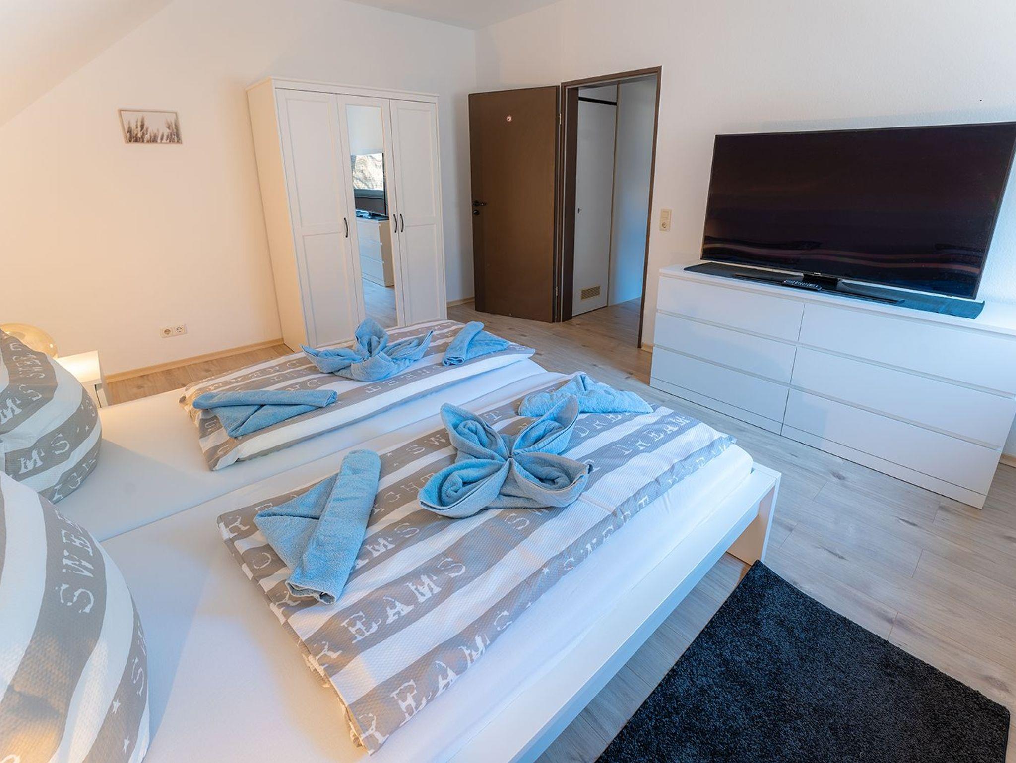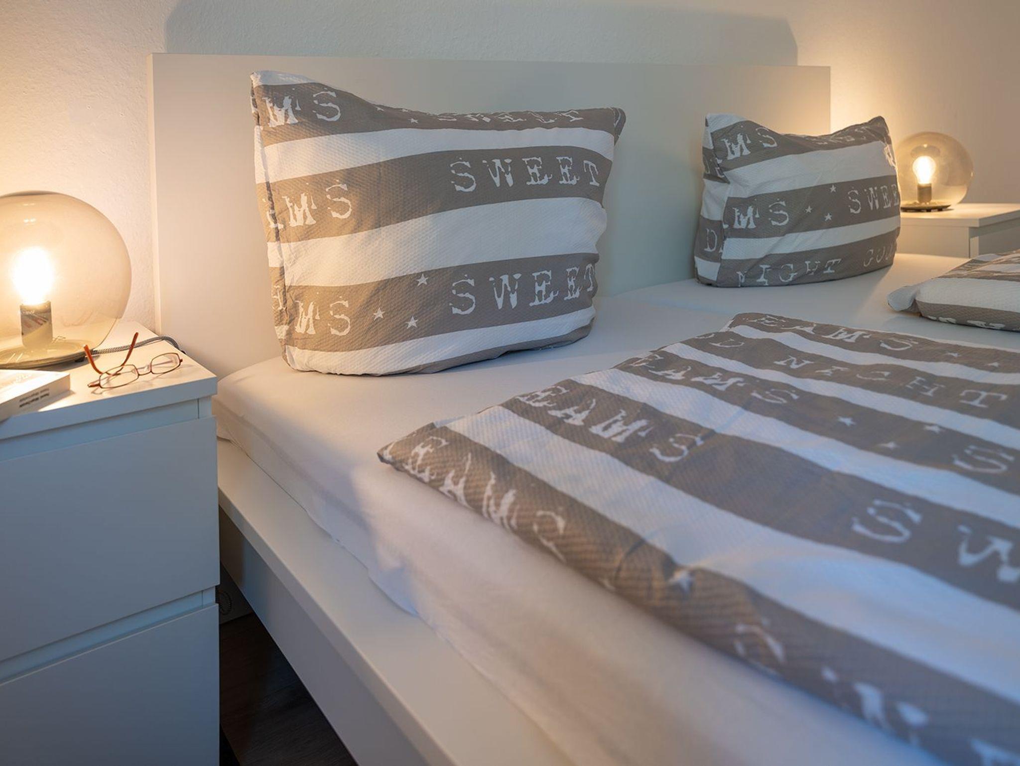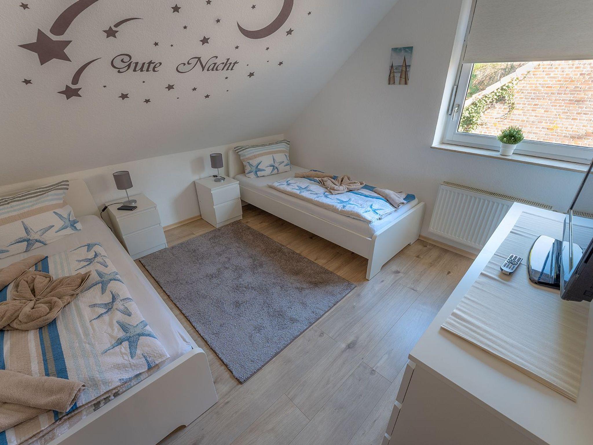Im ersten OG befinden sich das Fenster-Duschbad und zwei Schlafräume. Einer ist ausgestattet mit einem Doppelbett, der andere mit zwei Einzelbetten sowie je einen großen Kleiderschrank.