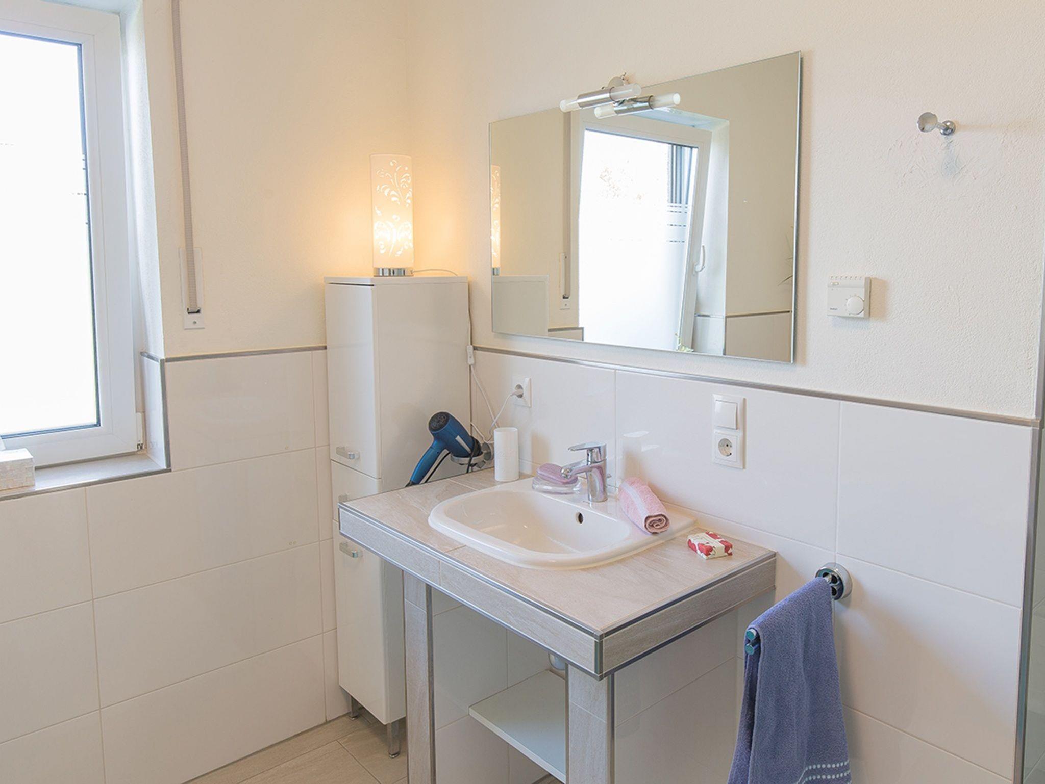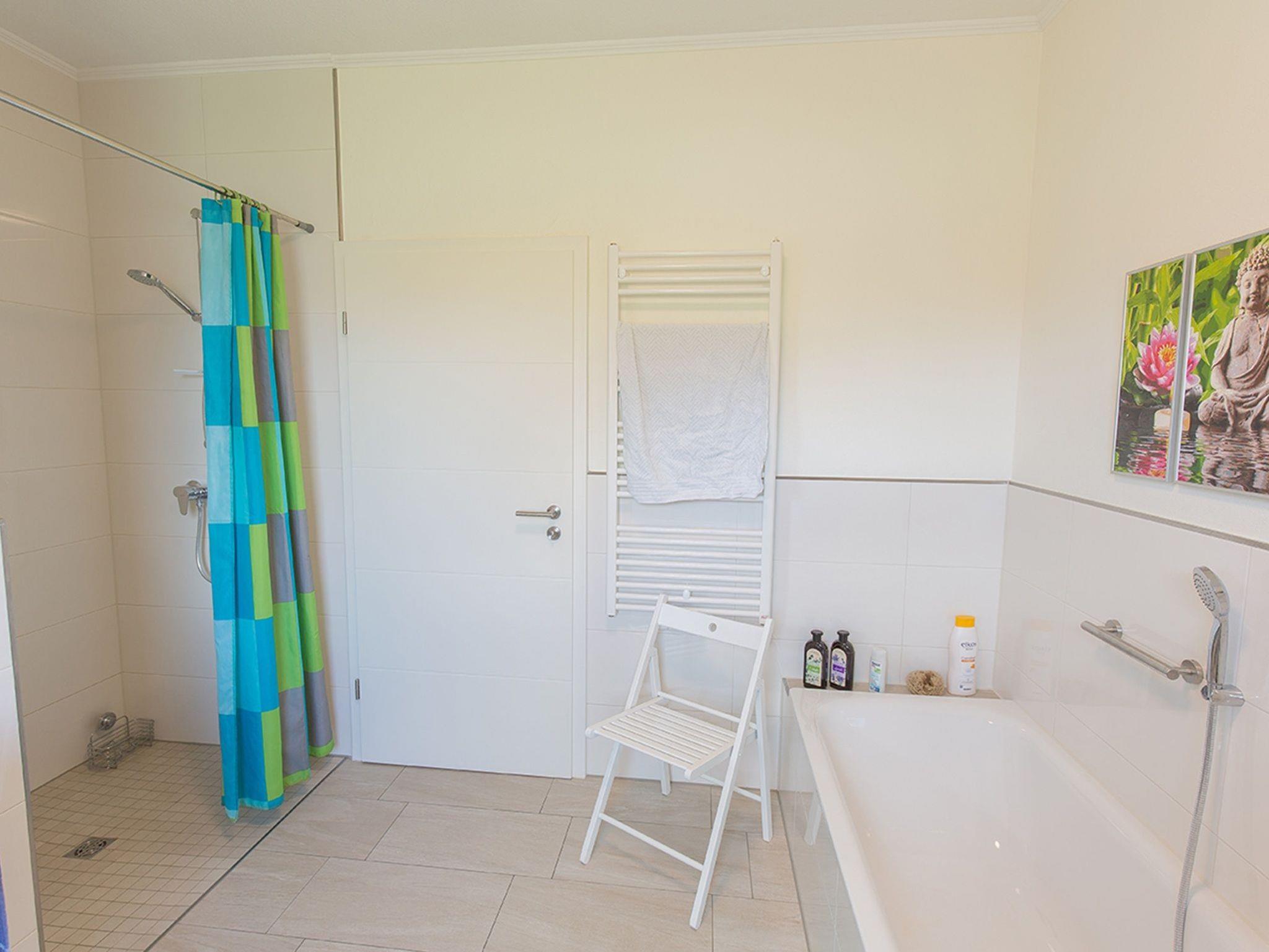 Das Fenster-Bad hat eine Wanne und eine Walk-In-Dusche sowie viel Platz für Kosmetika.