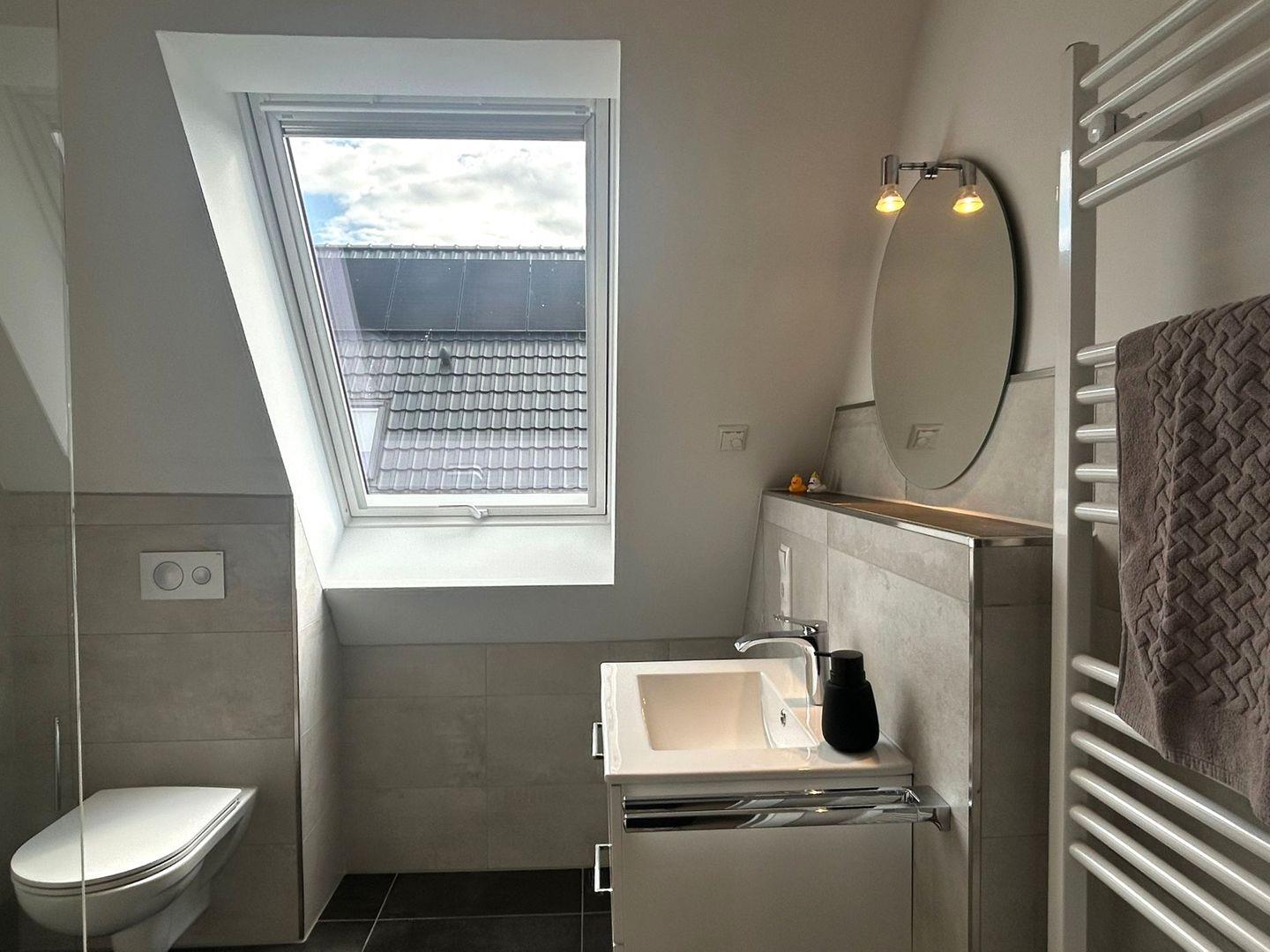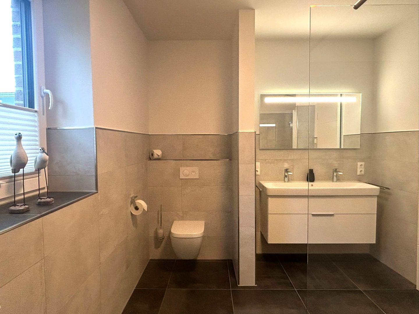 Duschbad im UG: bodentiefe, barrierefreie Regendusche, Waschtischanlage mit Spiegel, WC, Handtuchheizung, Haartrockner