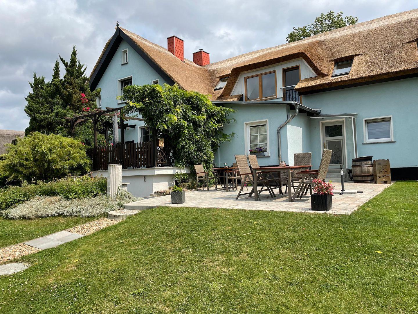 In dem kleinen, wunderschönen Örtchen Vilmnitz, direkt an der "Deutschen Alleenstraße" zwischen dem Ostseebad Binz und der zauberhaften Residenzstadt Putbus gelegen, befinden sich im reetgedeckten Ferienhaus insgesamt drei Ferienwohnungen. Die Ferienwohnung "Vilm" befindet sich im Erdgeschoß des Reetdachhauses. Die Ferienwohnungen "Goor" und "Muglitz" sind über eine separate Außentreppe im 1. OG zu erreichen. Die Wohnung "Vilm" mit einer Wohnfläche von ca. 105qm bietet Platz für maximal 5 Personen. Die Wohnung "Goor" mit einer Wohnfläche von ca. 92 qm bietet Platz für insgesamt 5 Personen. Die Wohnung "Muglitz" mit einer Wohnfläche von ca. 50 qm bietet Platz für insgesamt 3 Personen. Alle drei Wohnungen zusammen sind ideal für einen Urlaub mit Freunden oder in Großfamilie. Im liebevoll angelegten Bauerngarten stehen ausreichend Sitz-und Grillmöglichkeiten zur gemeinschaftlichen Nutzung zur Verfügung.Das insgesamt ca. 3000 qm große eingezäunte Grundstück verfügt über einen gepflasterten Vorplatz, über den man den großen Carport mit 3 Stellplätzen und Fahrradunterstellmöglichkeiten erreicht. Ihr Elektroauto können Sie während Ihres Aufenthaltes an der privaten E-Ladesäule im Carport laden. Im Haus gibt es ein WLAN und eine gemeinschaftliche Waschmaschine.
