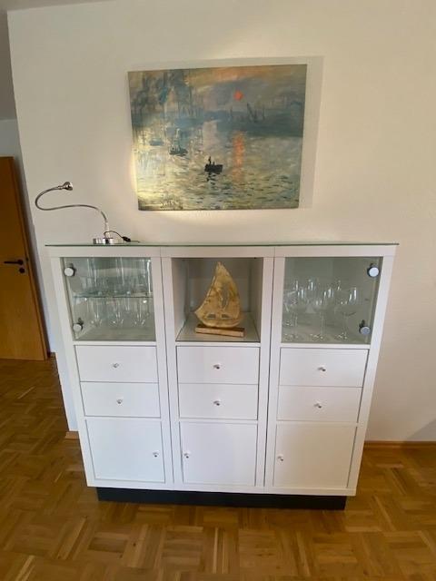 Begrüßungsgetränke im Kühlschrank und Salzgebäck, Kaffeepads drei Sorten, Tee drei Sorten Zucker + Kaffee Milch sowie Gewürze im Regal sind direkt in den Oberschränken