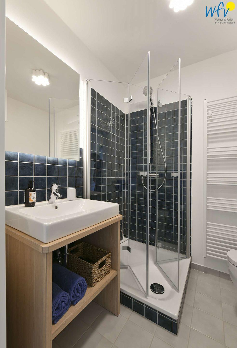 Wenn Sie es morgens aus den Federn geschafft habe, dann verspricht die Dusche in dem kleinen und feinen Meerbadezimmer den ultimativen Frischekick.