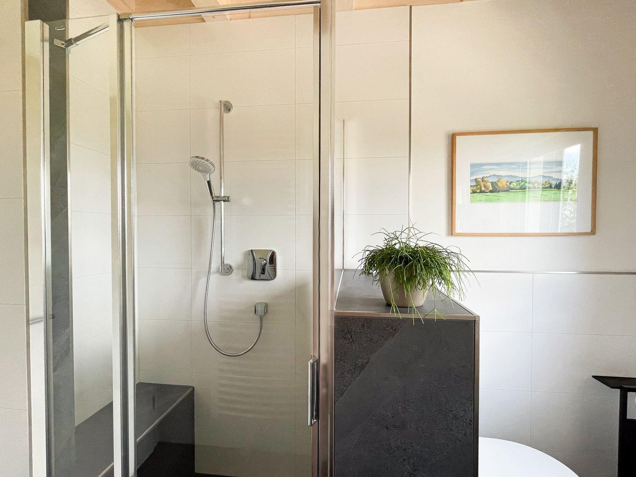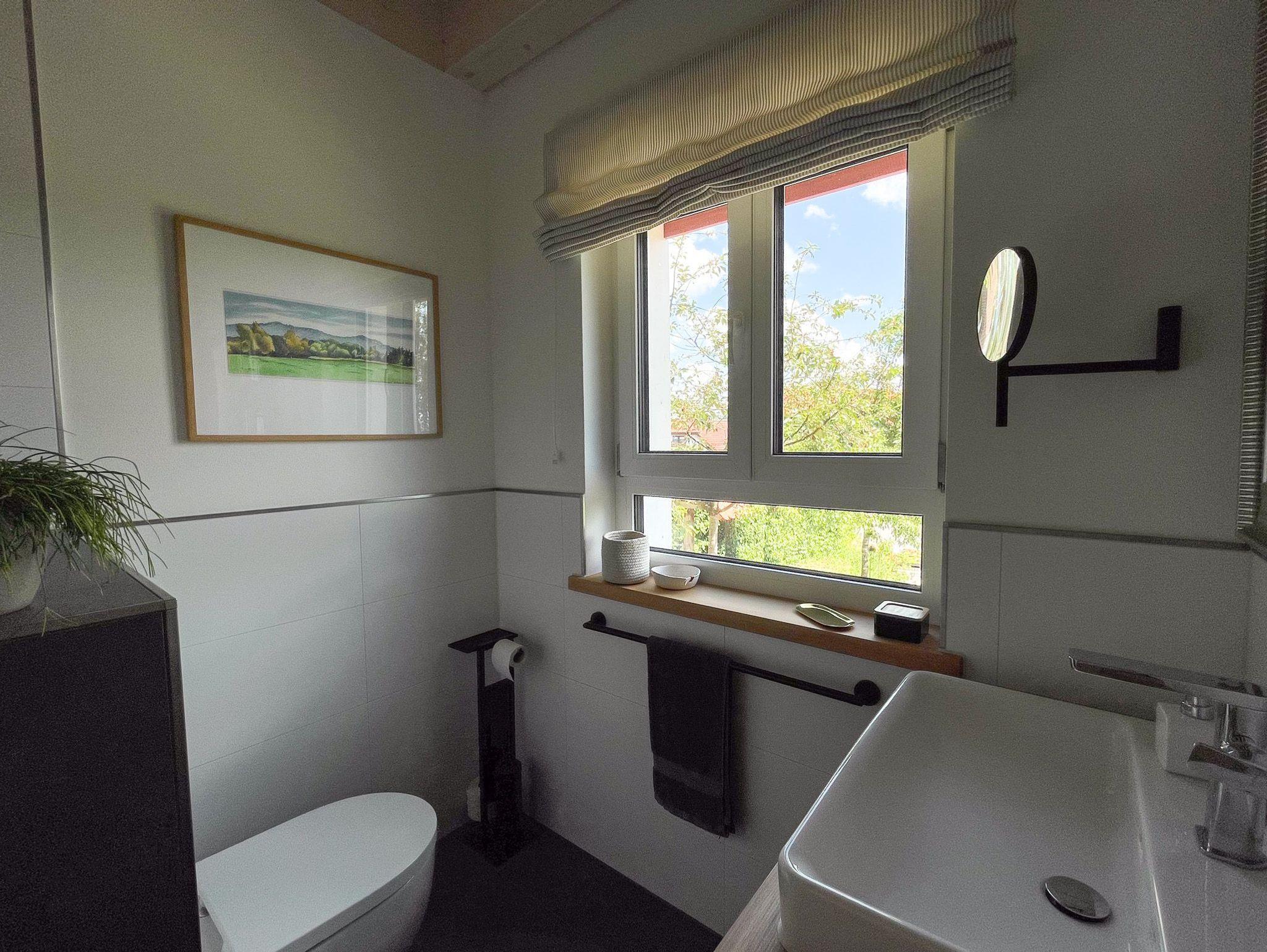 Ausstattung Bad EG: Dusche, WC, Waschbecken, Handtuchheizung, Haartrockner, Kinderhocker, Kinder-WC-Sitz