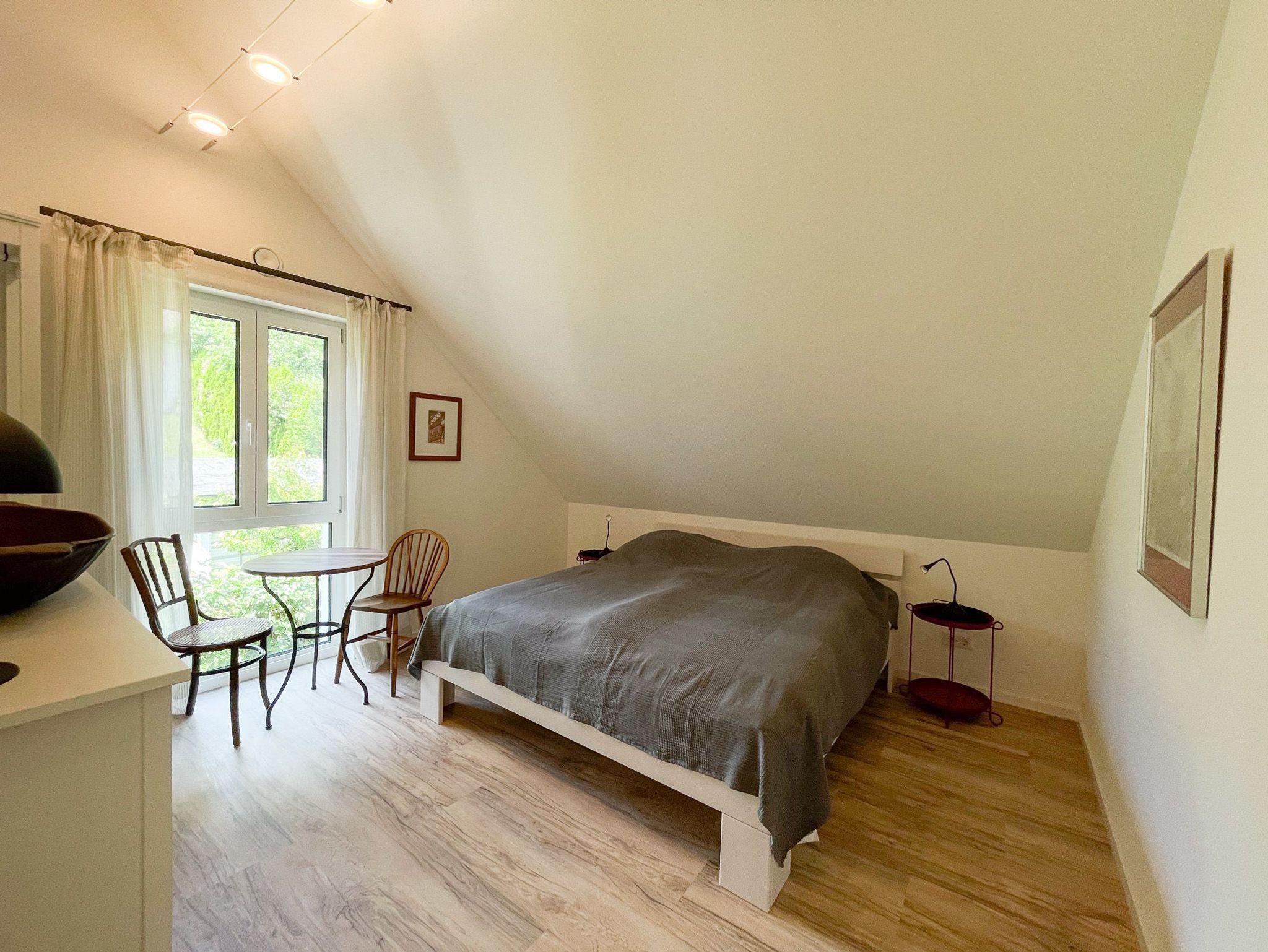 Das Obergeschoss ist bis zum Dachfirst offen gestaltet. Hier gibt es 3 Schlafzimmer mit jeweils einem Doppelbett 180/200, ein großes Bad mit Badewanne, ebenerdiger Dusche, 2 Waschmöglichkeiten und WC, Handtuchheizung, zusätzlich noch ein separates WC mit Waschbecken. Die offene Galerie mit bequemem Sessel ist ideal zum Entspannen, Lesen, Spielen.