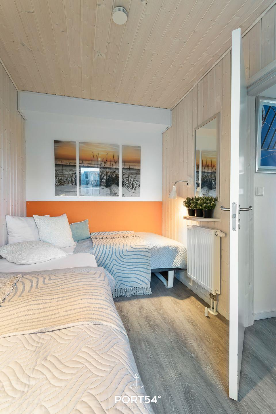 Über die Treppe erreichen Sie das Erdgeschoß. Das Herzstück im Erdgeschoß ist das kleine aber feine Wellness-Bad mit integrierter Sauna. Freuen Sie sich auf eine bodentiefen Regendusche. Ein Badschrank mit Schubladen für Ihre Kosmetikartikel befindet sich unter dem Waschbecken. Ebenfalls im Erdgeschoss befinden sich zwei Schlafzimmer : Das Erste liegt zur Seeseite. Es verfügt über bodentiefe Fenster, einen wunderschönen Blick in den Strandgarten und eine geräumige Terrasse. Sie schlafen in zwei nebeneinander stehenden, bequemen Einzel-Boxspringbetten (zusammen 180x200cm). Im diesem Schlafzimmer befindet sich ein Fernseher, die Fenster verfügen über Verdunkelungsvorhänge