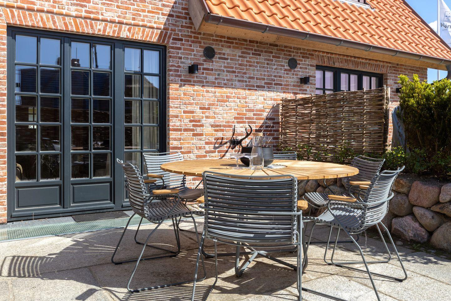 EG: Wohnzimmer mit Smart-TV, Couch und Sesseln und einem Gaskamin, der Essbereich bietet 6 Personen Platz, die Küche ist komplett ausgestattet mit Induktionskochfeld, Geschirrspüler, Mikrowellen-Backofen-Kombi, Filterkaffeemaschine, Nespressomaschine und einem Thermomix. Auf der Terrasse steht ein Strandkorb, ein Tisch und Stühle für Sie bereit. Im Erdgeschoß ist noch ein kleines Gäste-WC vorhanden.