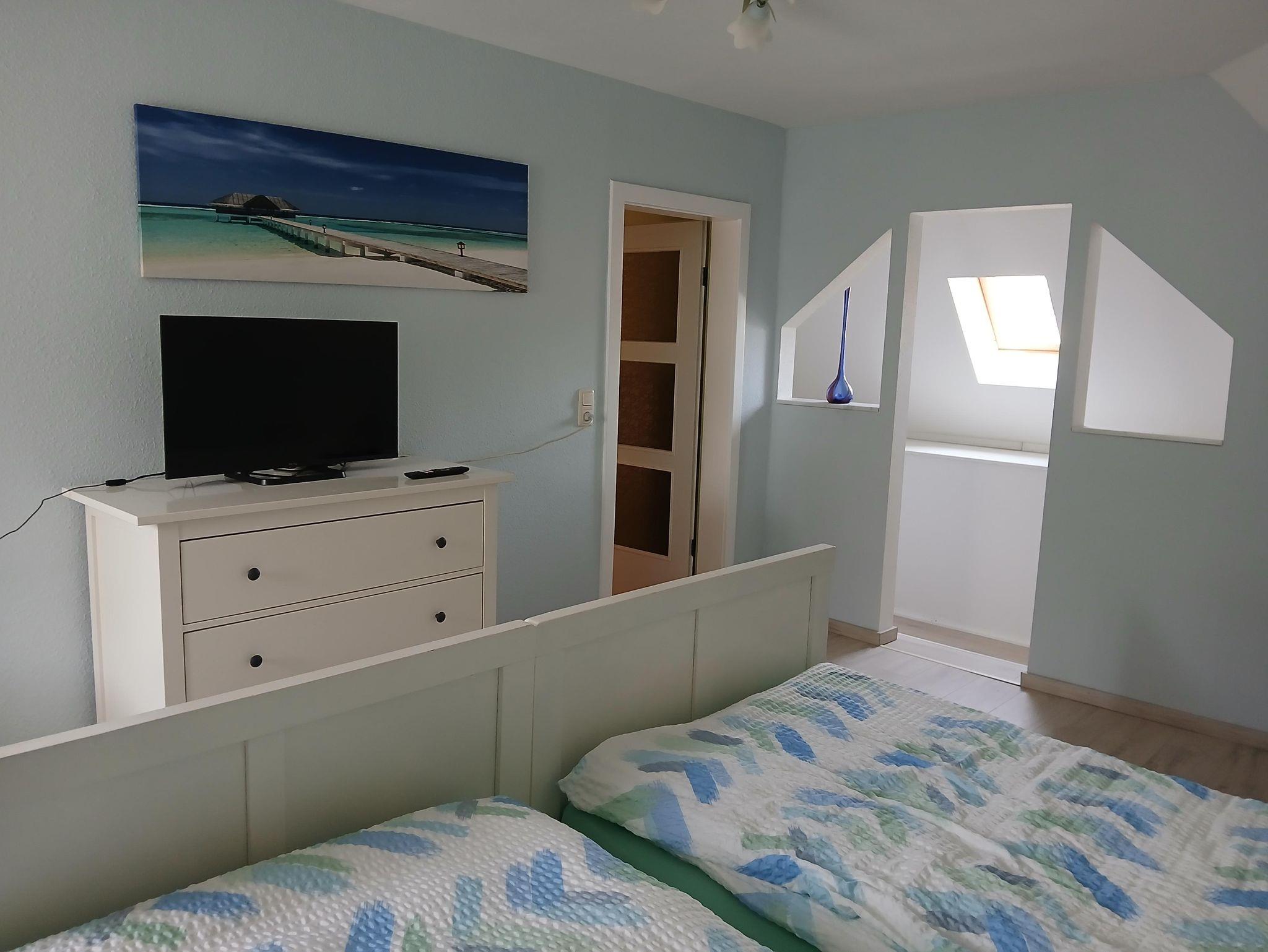 Die großzügige Ferienwohnung im Obergeschoss bietet Platz für bis zu sechs Personen und ist ideal für Familien oder kleine Gruppen. Zwei gemütliche Schlafzimmer sorgen für erholsame Nächte – eines mit einem bequemen Doppelbett und eines mit zwei Einzelbetten. Im offenen Wohnbereich mit Küche lädt ein ausziehbares kleines Doppelbett zum Entspannen oder als zusätzliche Schlafgelegenheit ein.