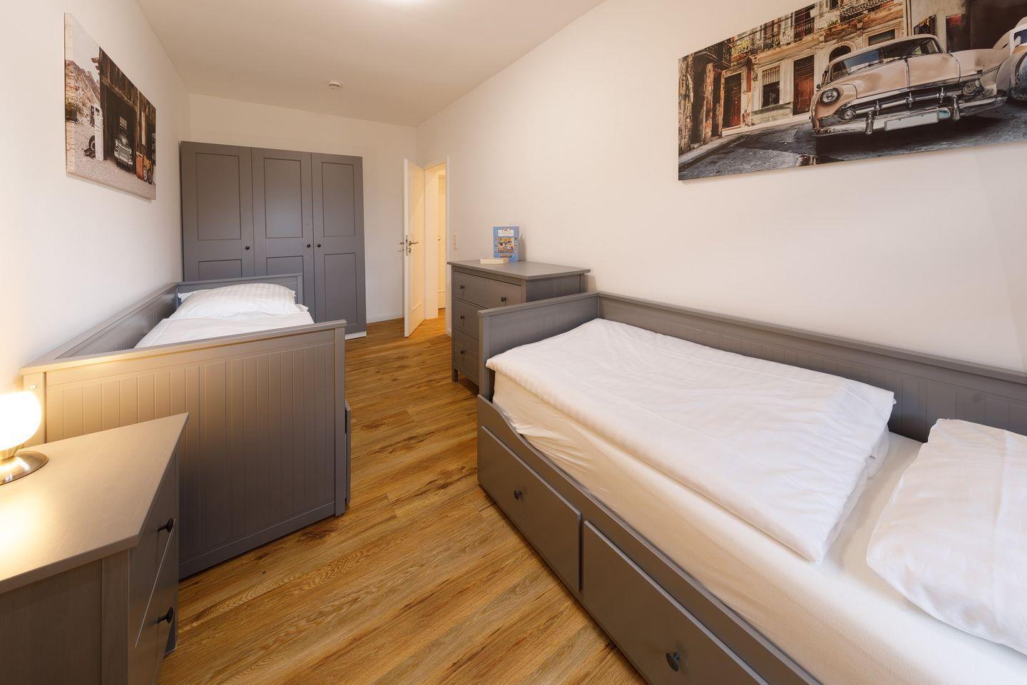 Diese Ferienwohnung bietet Platz für maximal 6 Gäste. Sie verfügt über ein Schlafzimmer mit Doppelbett, großem Kleiderschrank und einer Kommode. Das zweite Schlafzimmer verfügt über zwei Tagesbetten. Diese Betten können bei Bedarf ausgezogen werden um so insgesamt 4 Personen Platz zu bieten. Auch dieses Schlafzimmer verfügt über einen Kleiderschrank und eine Kommode.
