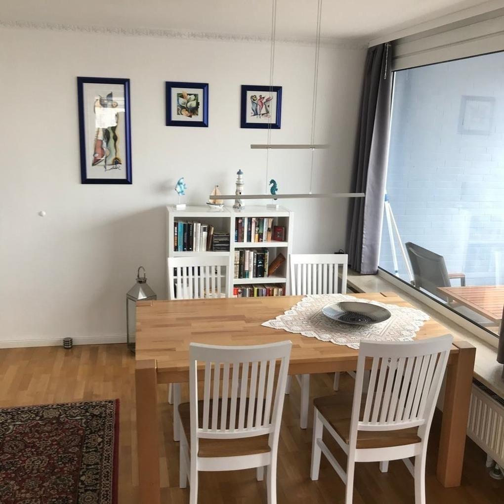 Im hellen Wohnzimmer befindet sich ein gemütliches Ecksofa auch als Schlafcouch ausziehbar (hier könnte eine dritte Person gegen einen Aufpreis von 10 Euro am Tag schlafen!), ein Kabel-Flachbau-TV, eine Essecke und der Eingang zur Einbauküche und der Zugang zum Balkon mit Balkonmöbeln. Jetzt neu mit WLAN!