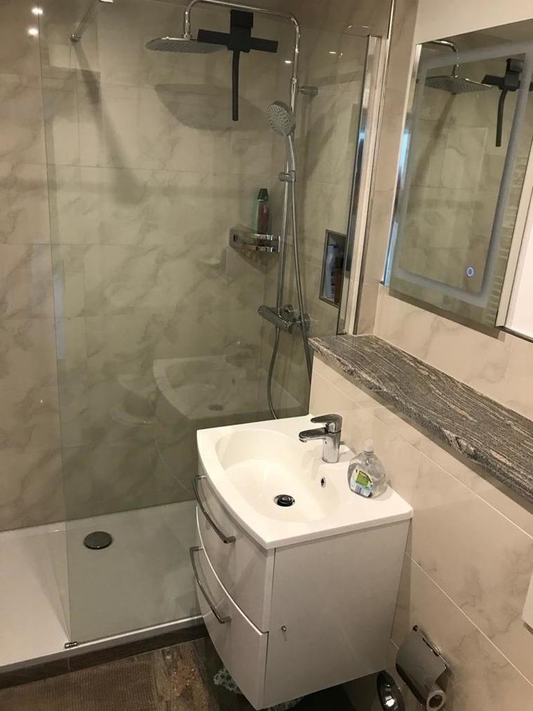Im neue Badezimmer befindet sich eine großzügige Dusche mit extraflachem Einstieg, Handtuchtrockner, Waschtisch, WC und ein Fön.