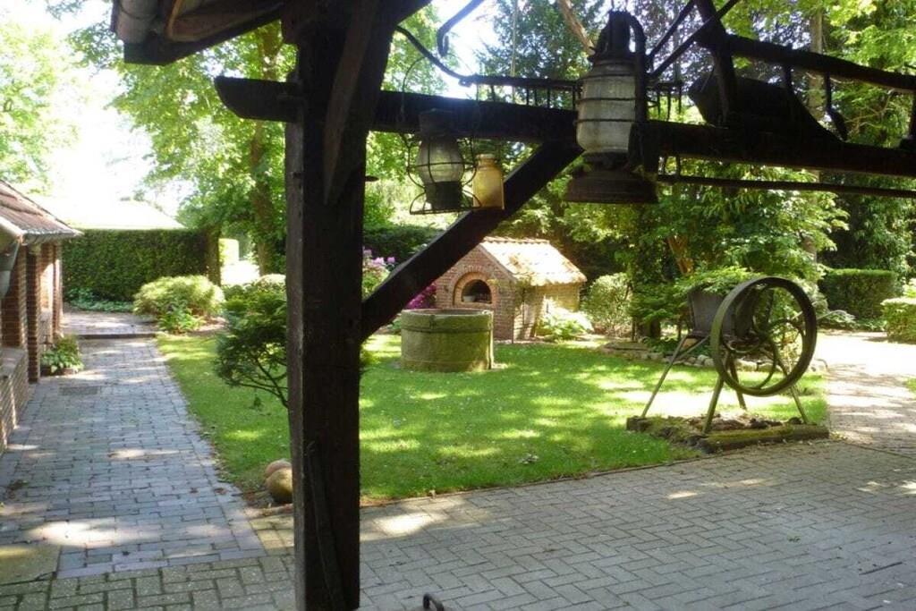 Charmante und großzügige Ferienwohnung in idyllischer Außenbereichslage. Die Wohnung befindet sich im Seitentrakt des Bungalow. Die DTV-Zertifizierung ist 4 Sterne. Kinder bis 16 Jahren sind frei. Von charaktervollen Laubbäumen umrahmtes Grundstück in landschaftlich ruhiger Lage. ein Blütenparadies, insbesondere aufgrund des alten wertvollen Rhododendronbestandes. 20 wertvolle Mammutbäume (Sequoias) grenzen den Garten nach Westen hin ein. Auf dem traumhaften Gartengrundstück mit einem grossen Bauerngarten befinden sich der Bungalow mit Anbau,. Ein ehemaliges Heuerhaus, historische Remise (ehem. Torfschuppen), Brunnen, Backhaus, Schwimmbad (zur Zeit geschlossen) und Sauna. Stromversorgung aller Ferienwohnungen über eine PV-Anlage und Stromspeicher.
