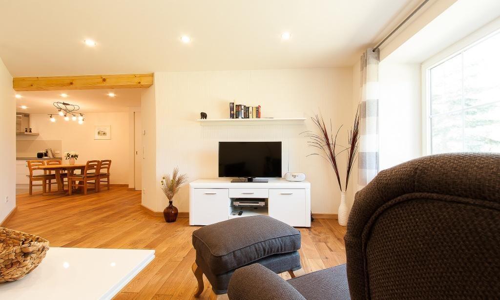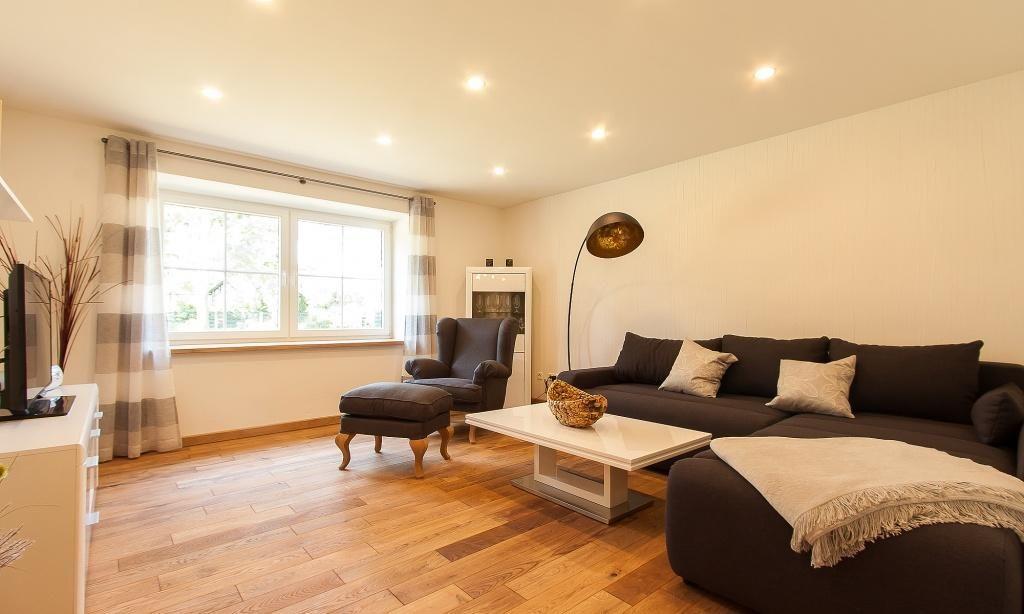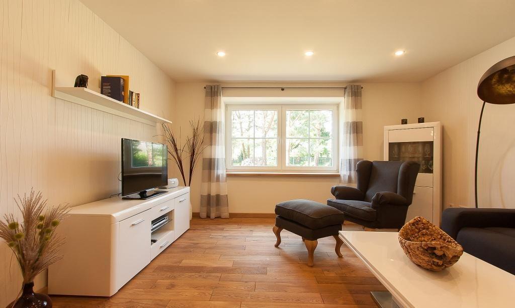 Die Erdgeschosswohnung verfügt über einen großzügigen Wohnraum mit einer gemütlichen Sitzecke. Die hochwertige Küchenzeile und der angrenzende Essbereich separieren sich vom Wohnbereich. Ein Kaminofen sorgt für Behaglichkeit. Weiterhin gibt es zwei Schlafzimmer, die jeweils mit einem Doppelbett ausgestattet sind. Das Tageslicht-Bad mit Dusche/WC und ein Gäste-WC finden außerdem Platz. Ein Terrasse mit Blick in den Garten gehört selbstverständlich zur Wohnung dazu und beschert dir erholsame Stunden.