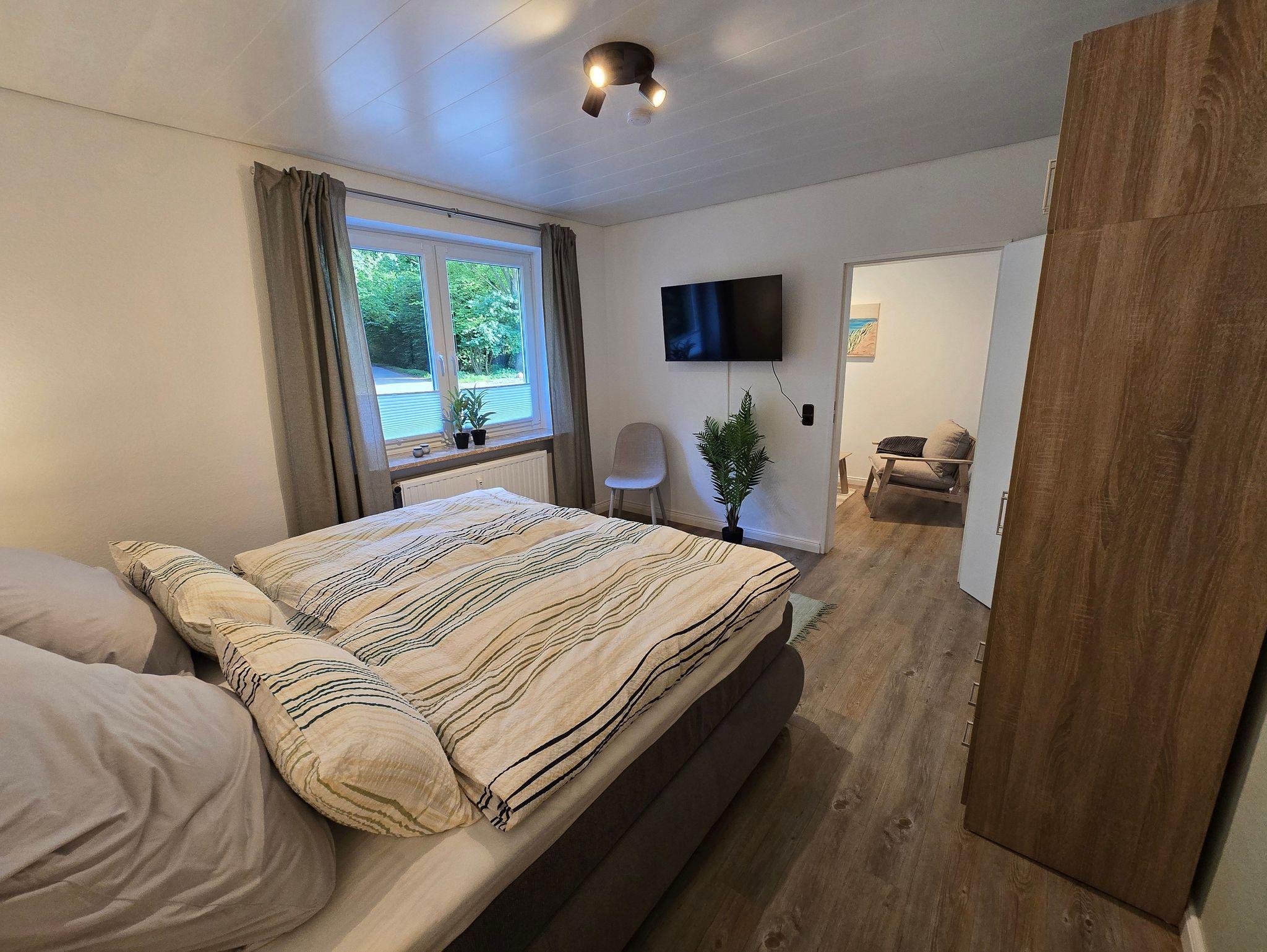 - Schlafzimmer 2 mit großem Boxspringbett, Schrank, Nachttisch und Flachbildfernseher