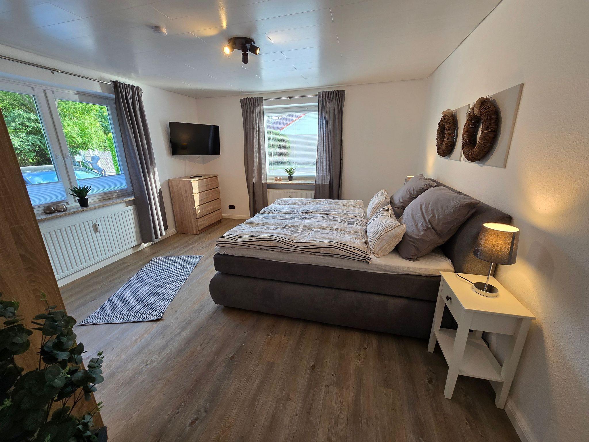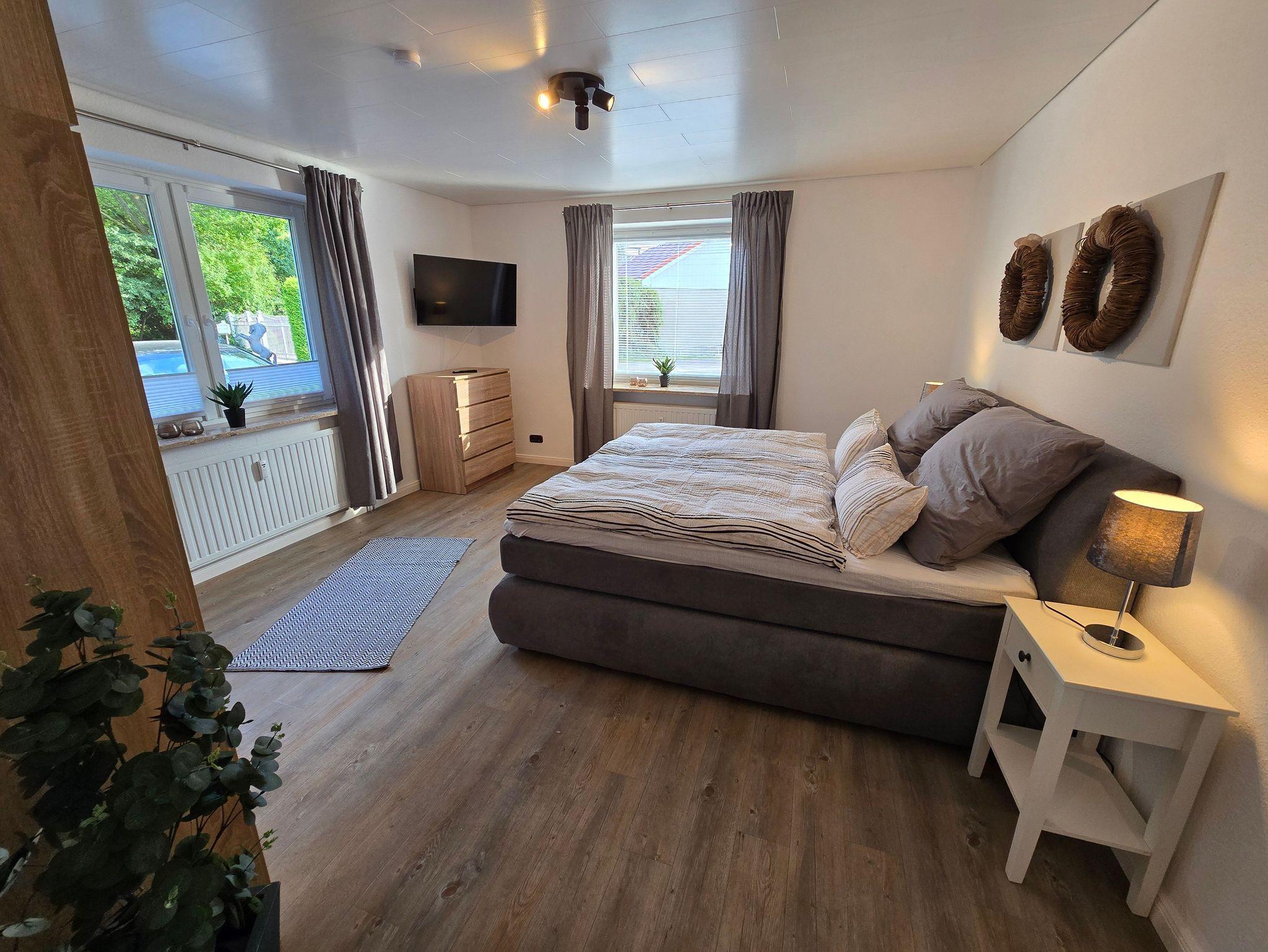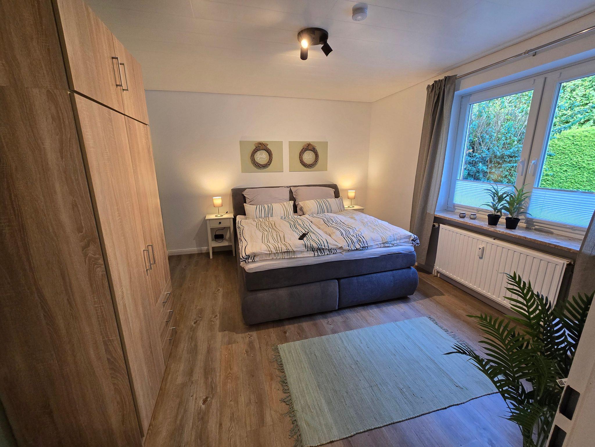 - Schlafzimmer 1 mit großem Boxspringbett, Schrank, Nachttisch und Flachbildfernseher