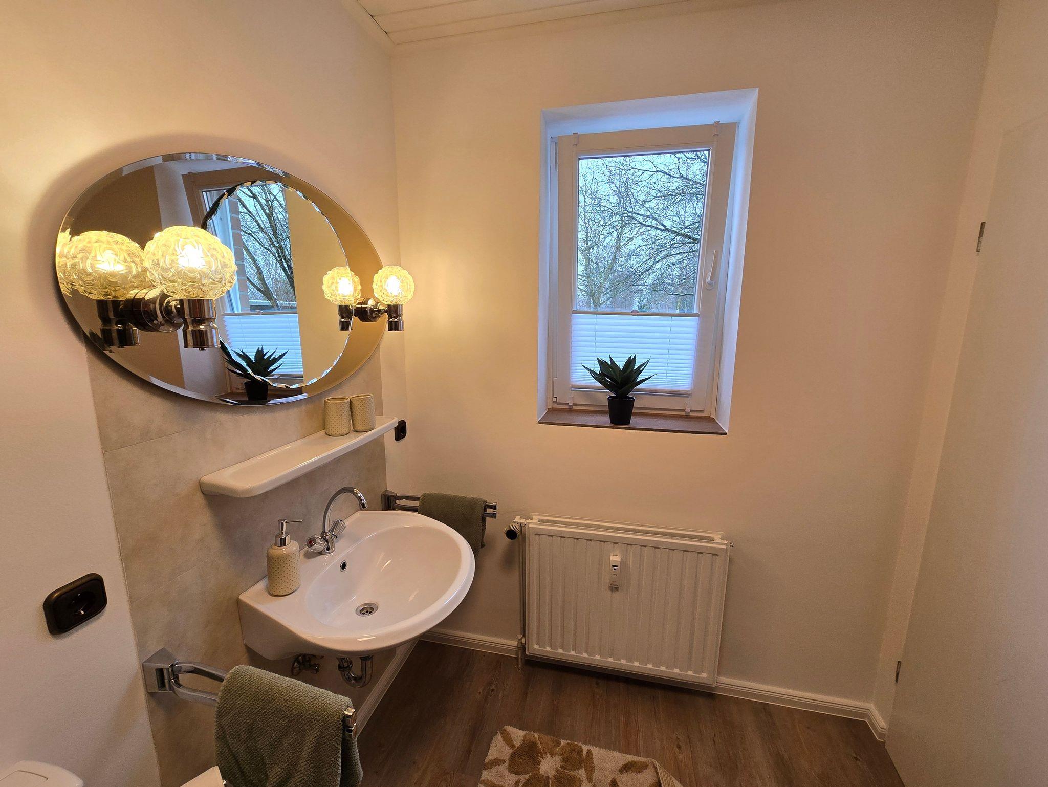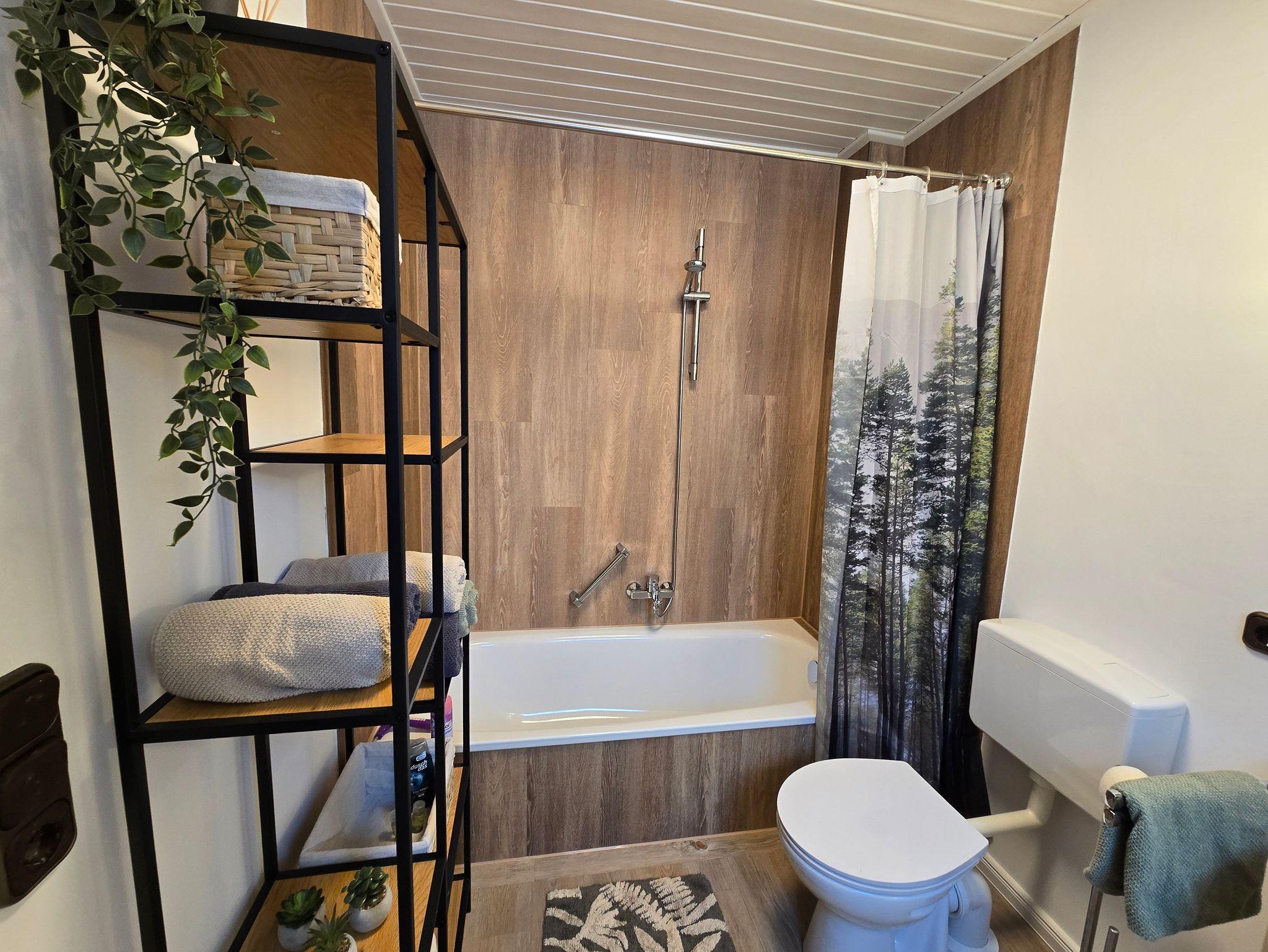 - Badezimmer mit Duschwanne, Wc, Waschbeken, Föhn, Regal mit Handtüchern usw. (seit 1/26 komplett neu)