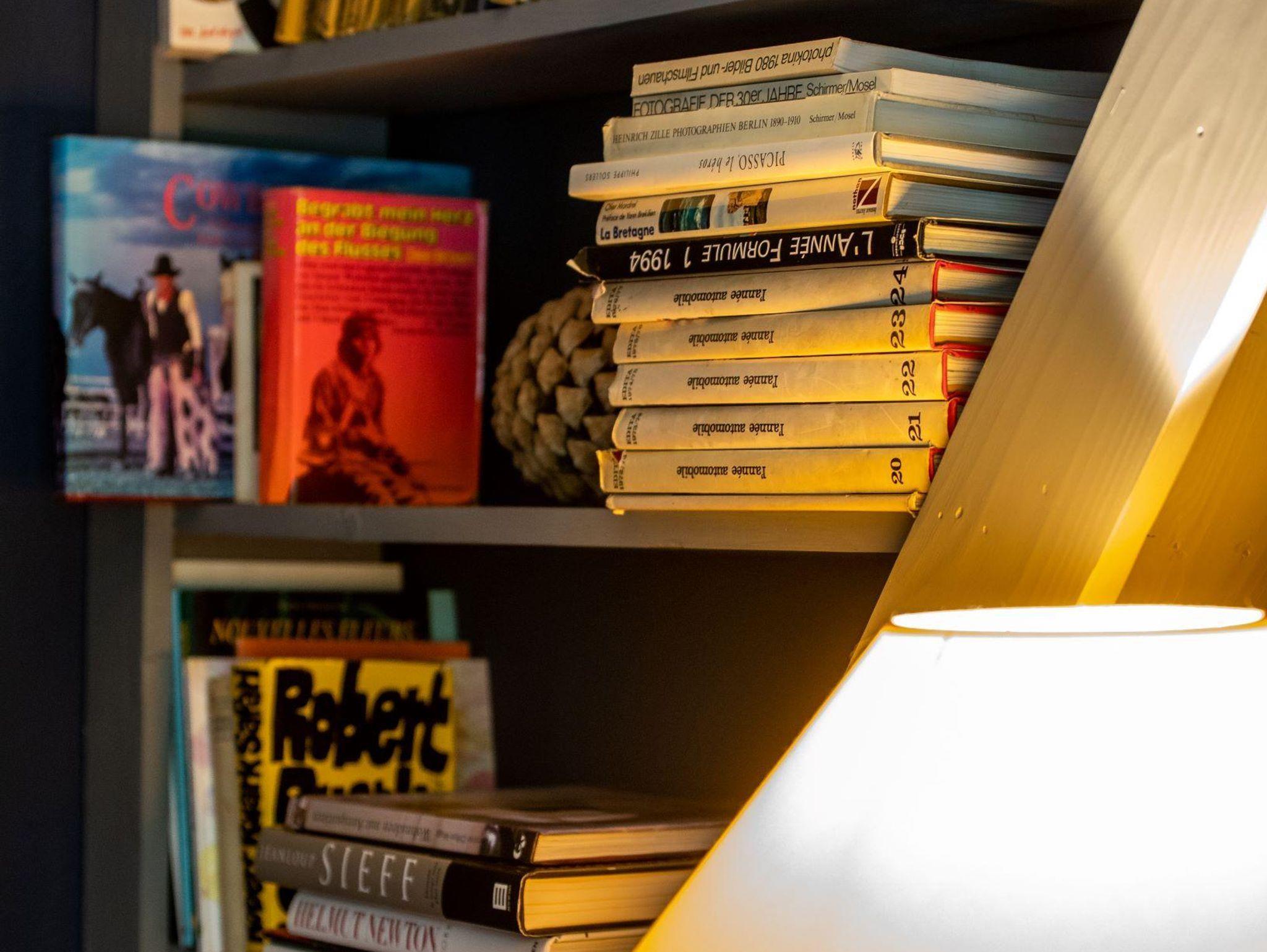 Das Wohnzimmer verfügt über eine Couch, zwei Ohrensessel, einen Couchtisch, eine Bibliothek, einen Flatscreen Fernseher, eine Bluetooth-Box und einen Kamin für gemütliche Stunden an kälteren Tagen.