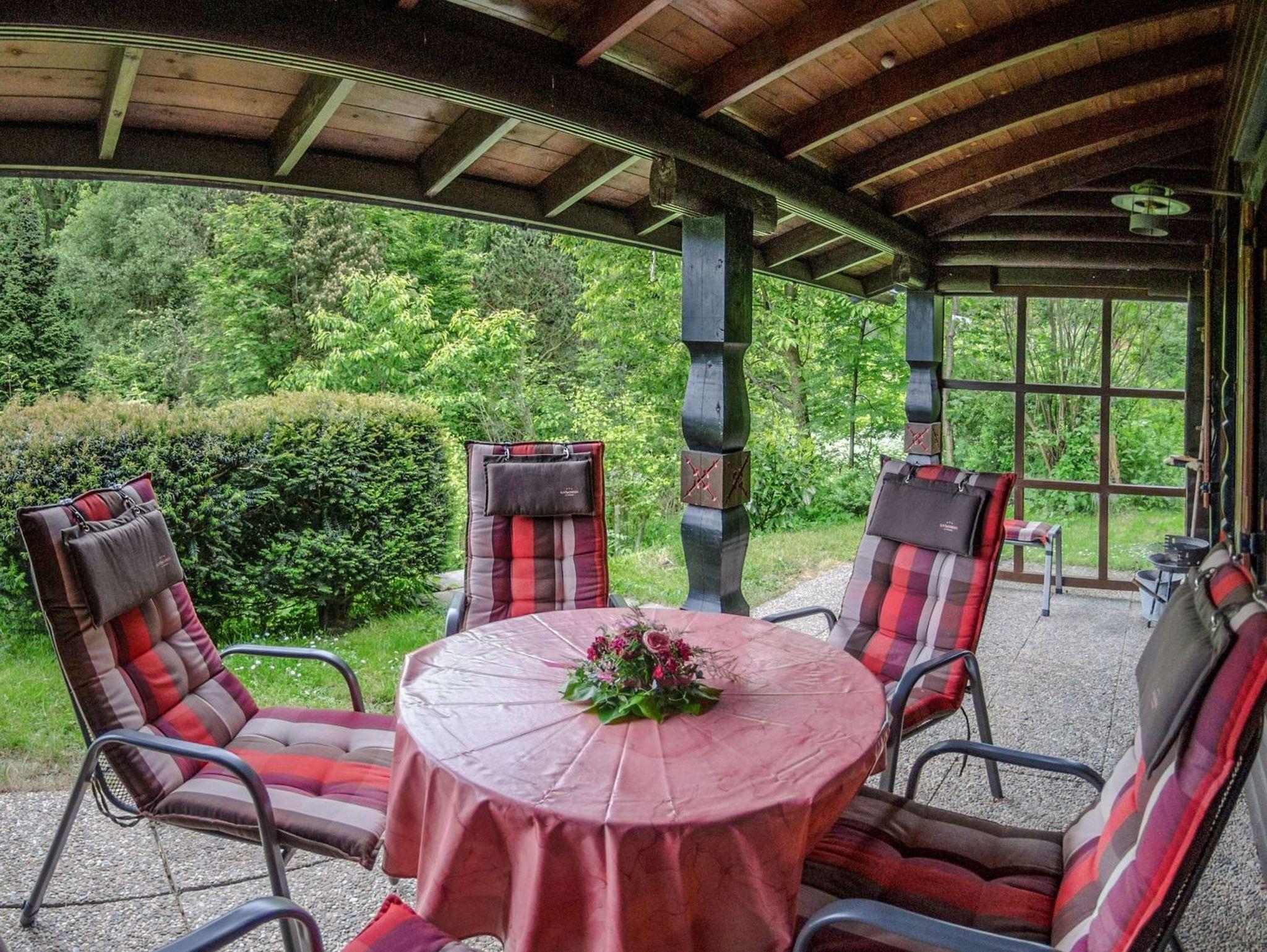 Auf der großen, überdachten Süd-West-Terrasse befinden sich Gartenmöbel mit Auflagen, Liegen und ein Weber-Holzkohlegrill. Eine große Sonnenliegewiese schließt sich gleich an der Terrasse an.