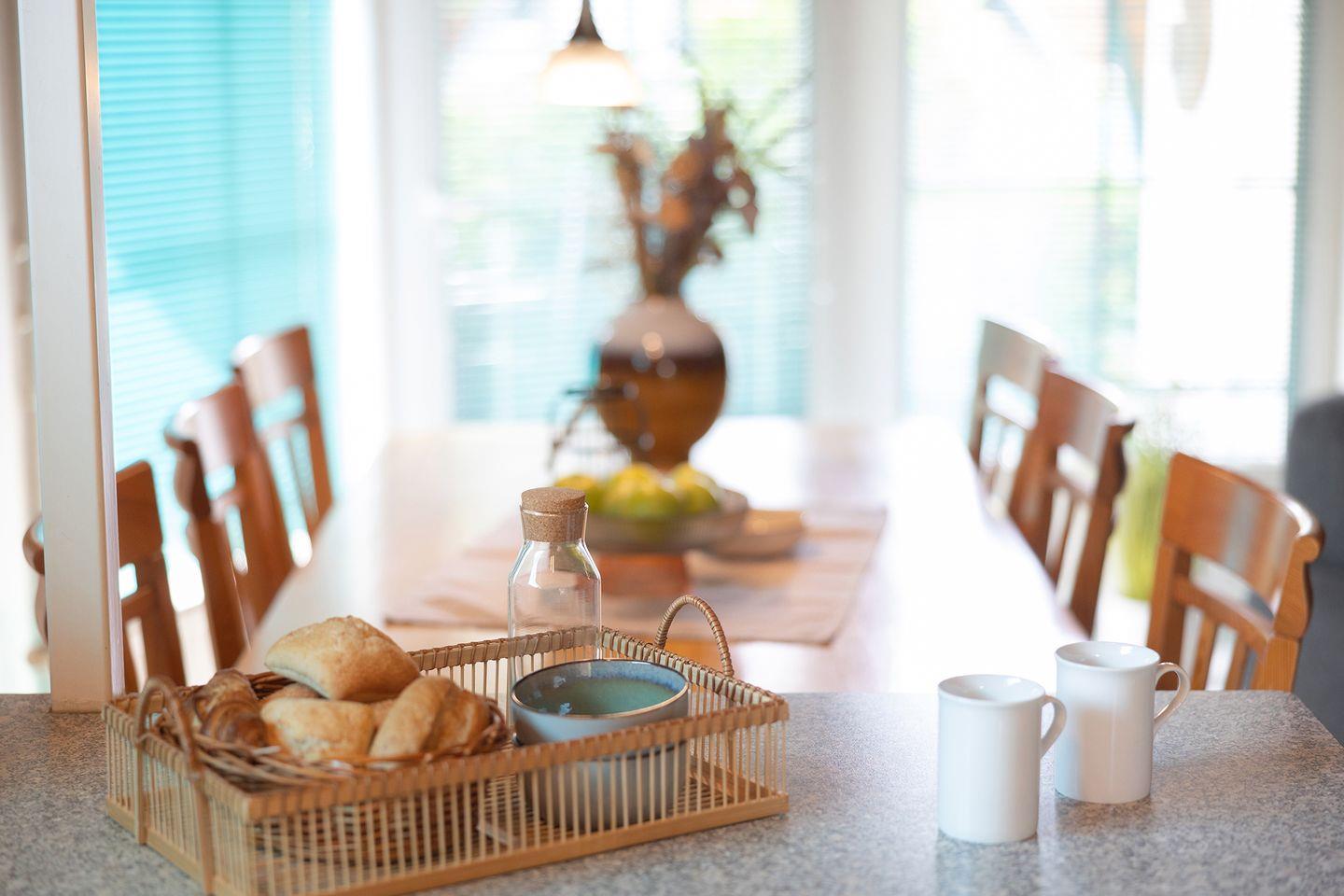 Nach dem Frühstück zieht die Familie die Gummistiefel an – erst zum Leuchtturm, dann Muscheln sammeln am Strand. Zurück im Ferienhaus für Familien an der Nordsee wartet schon der gemütliche Wohnbereich mit Kaminofen, offener Küche und großem Esstisch.