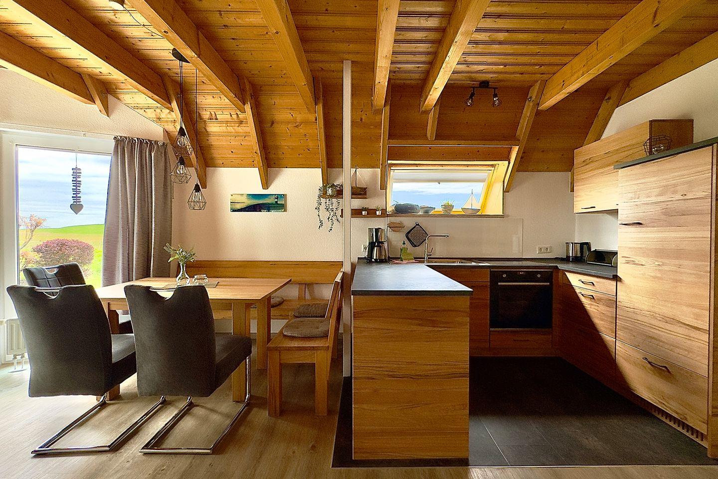 Drinnen wartet ein gemütliches Wohnzimmer mit Kaminofen auf dich. Die offene Küche ist mit Spülmaschine und ausgestattet. Das Tageslichtbad mit Dusche ist hell und freundlich. Dort findest du auch eine Waschmaschine - praktisch wenn du länger bleibst.