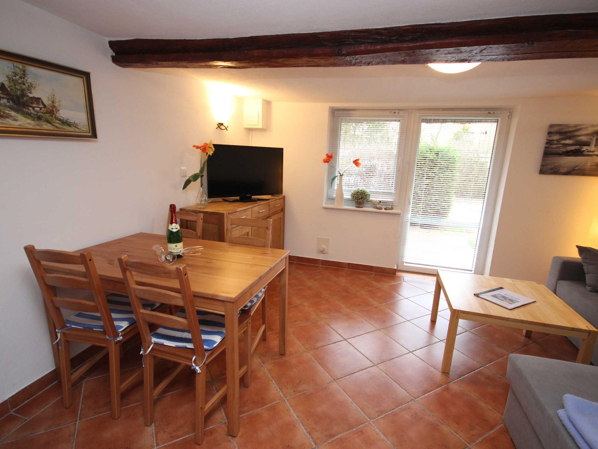 Es handelt sich hierbei um eine großzügige offene 2- Zimmer- Wohnung in dem 1795 erbauten Teil der alten Büdnerei. Die Wohnung ist perfekt für 4 Personen geeignet und hat einen separaten Zugang. Die niedrige Deckenhöhe von maximal 2,00 m und das von alten Balken durchzogene Mauerwerk verleihen dieser Wohnung ihren besonderen Charme. Die kleine südlich gelegeneTerrasse schließt sich an das Wohnzimmer an und lädt zum gemeinsamen Frühstück ein oder genießen Sie die ruhigen Abende. Die Ausstattung der Wohnung umfasst ein helles, gemütlich eingerichtetes Wohnzimmer mit Essplatz, Eckcouch und kostenlosen- WLAN- Zugang. Die offene moderne Küchenzeile ist gut ausgestattet mit Geschirrspüler, Wasserkocher, Toaster und Kaffeemaschine.Der Flur ist offen gestaltet und führt hin zum geschlossenen innenliegenden Kinderzimmer mit einer Schlafcouch. Das Schlafzimmer mit Doppelbett 1,80 x 2,00 m und getrennten Matratzen ist vom Wohnzimmer erreichbar. Vom WC-Bereich (innen liegend) eröffnet sich durch einen Zugang von 1,60 m Höhe ein sehr großzügiges Bad mit Badewanne und Dusche. Ihr Urlaubsdomizil befindet sich in ruhiger Lage und ist fußläufig in ca. 10 min vom feinsandigen Ostseestrand und ca. 5 min vom Wustrower Hafen entfernt. Die Wohnung wird inclusive Bettwäsche übergeben, Handtücher können in der Zimmervermittlung für 7,00 € pro Person (1 Badetuch, 1 Handtuch) dazugebucht werden. Alle unsere Wohnungen sind Nichtraucherwohnungen.Haustiere sind herzlich willkommen. Grillen ist nicht erlaubt.