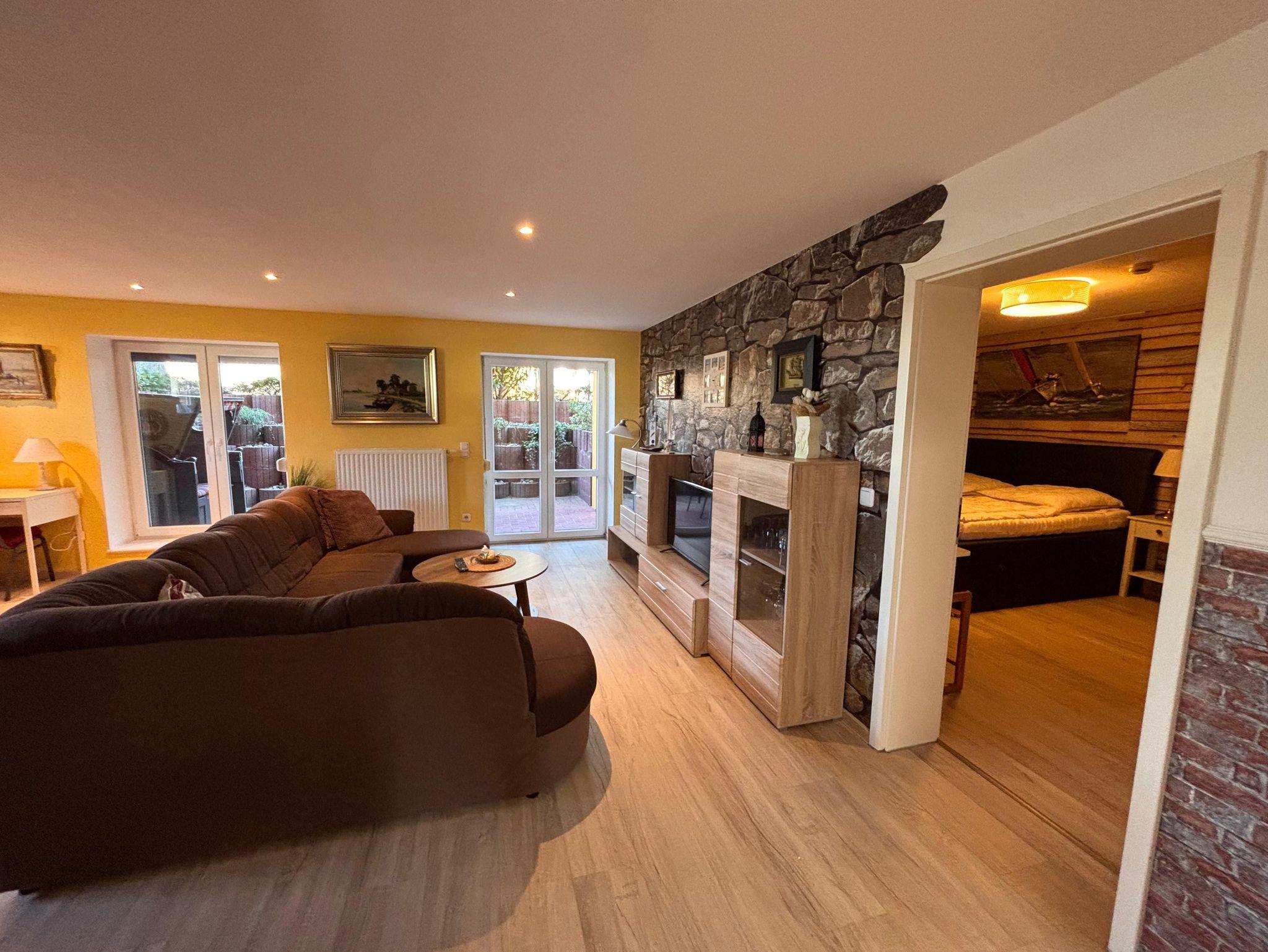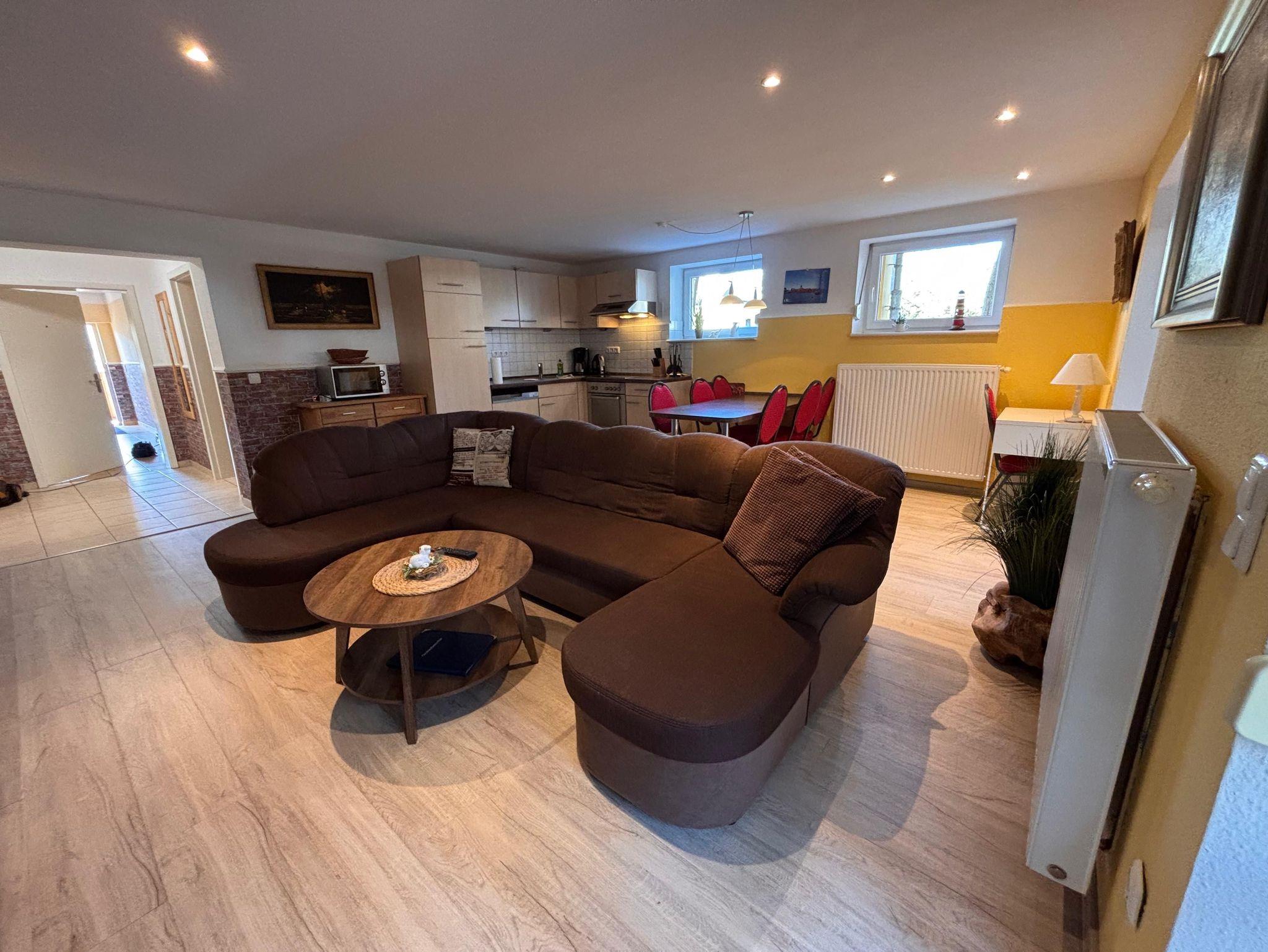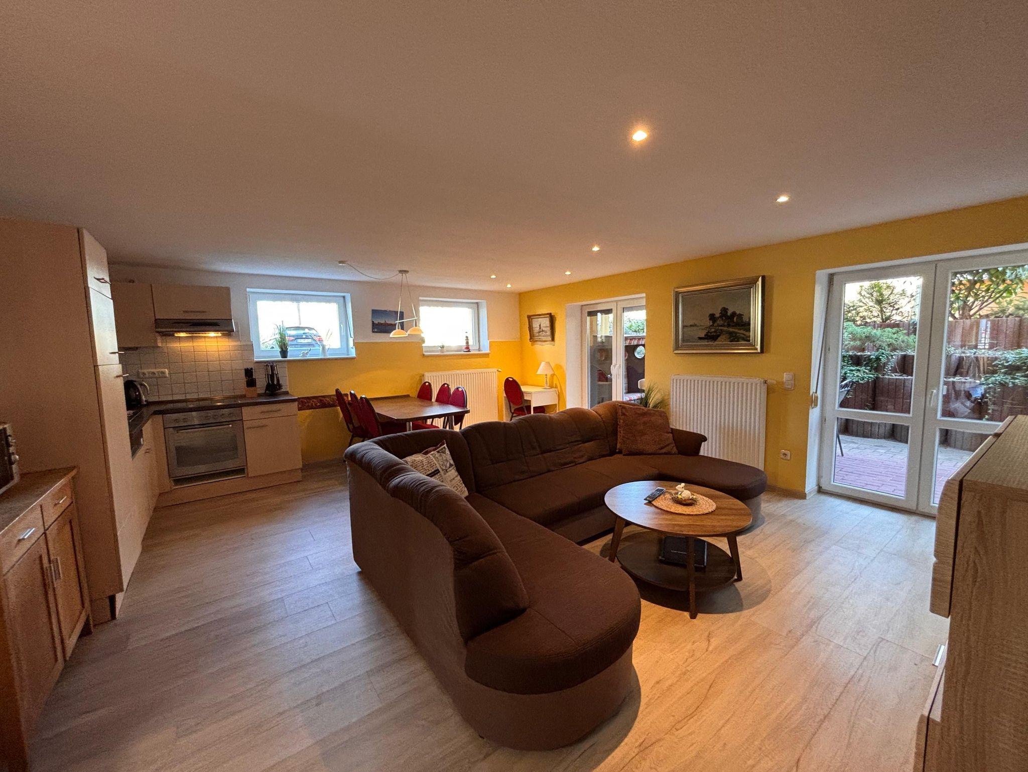 Schön eingerichtete 3-Zimmer Souterrain Ferienwohnung „Ostseedüne“ mit einer großen, möblierten Terrasse. Die Ferienwohnung ist ausgestattet mit einer offenen Küche und Essbereich. Der Wohnbereich verfügt eine große, gemütliche Couch und einem Flachbild-TV mit DVD Player.