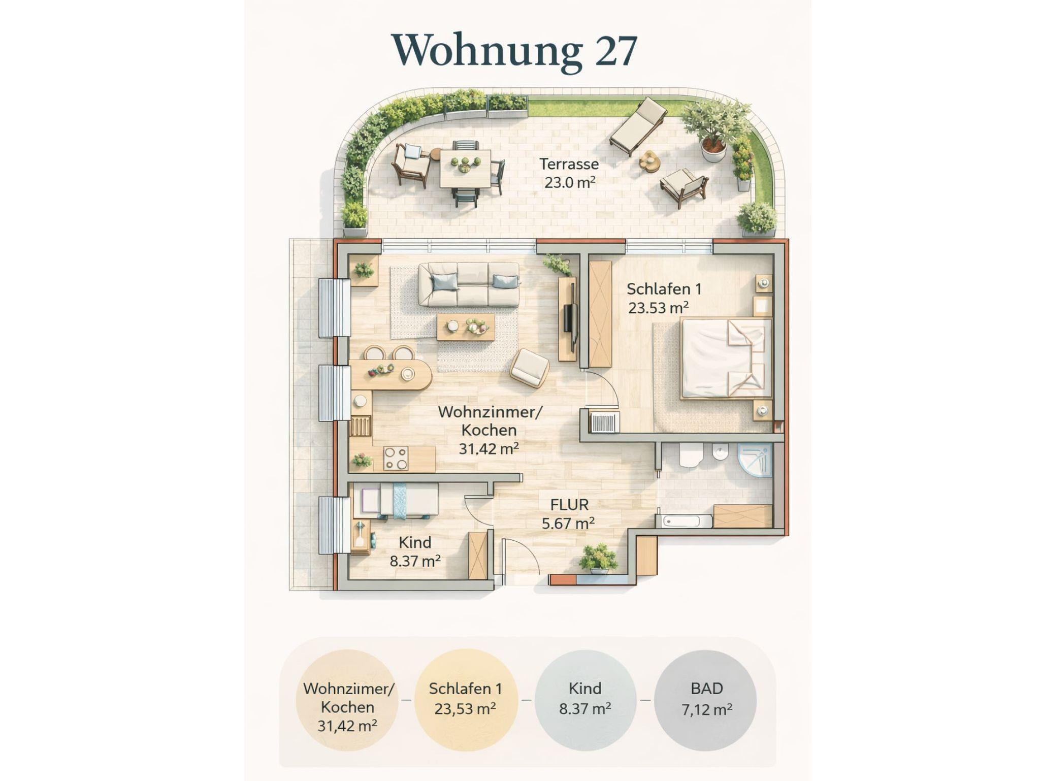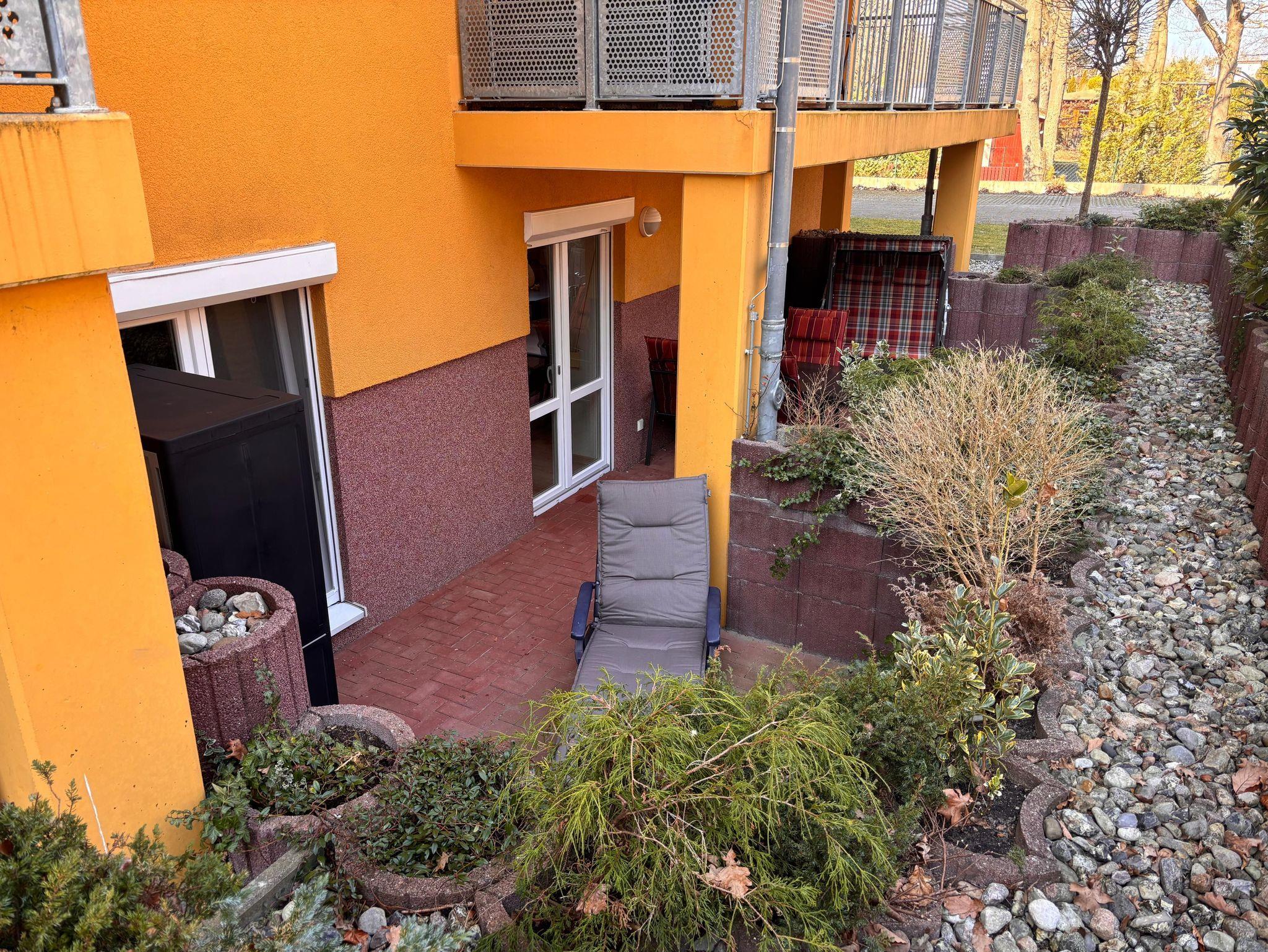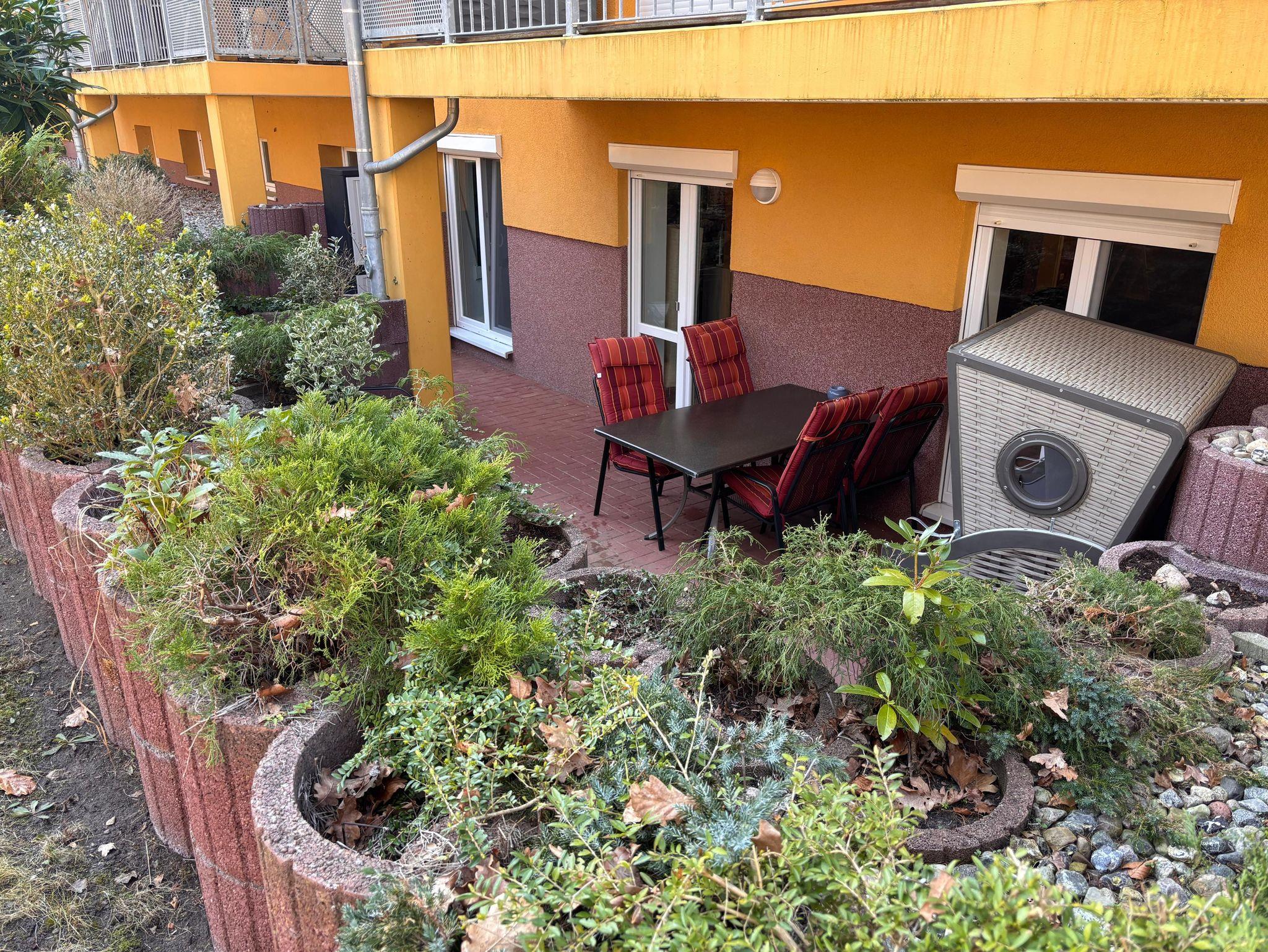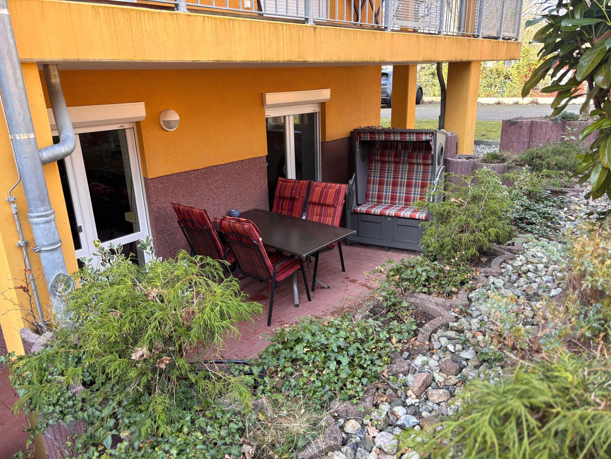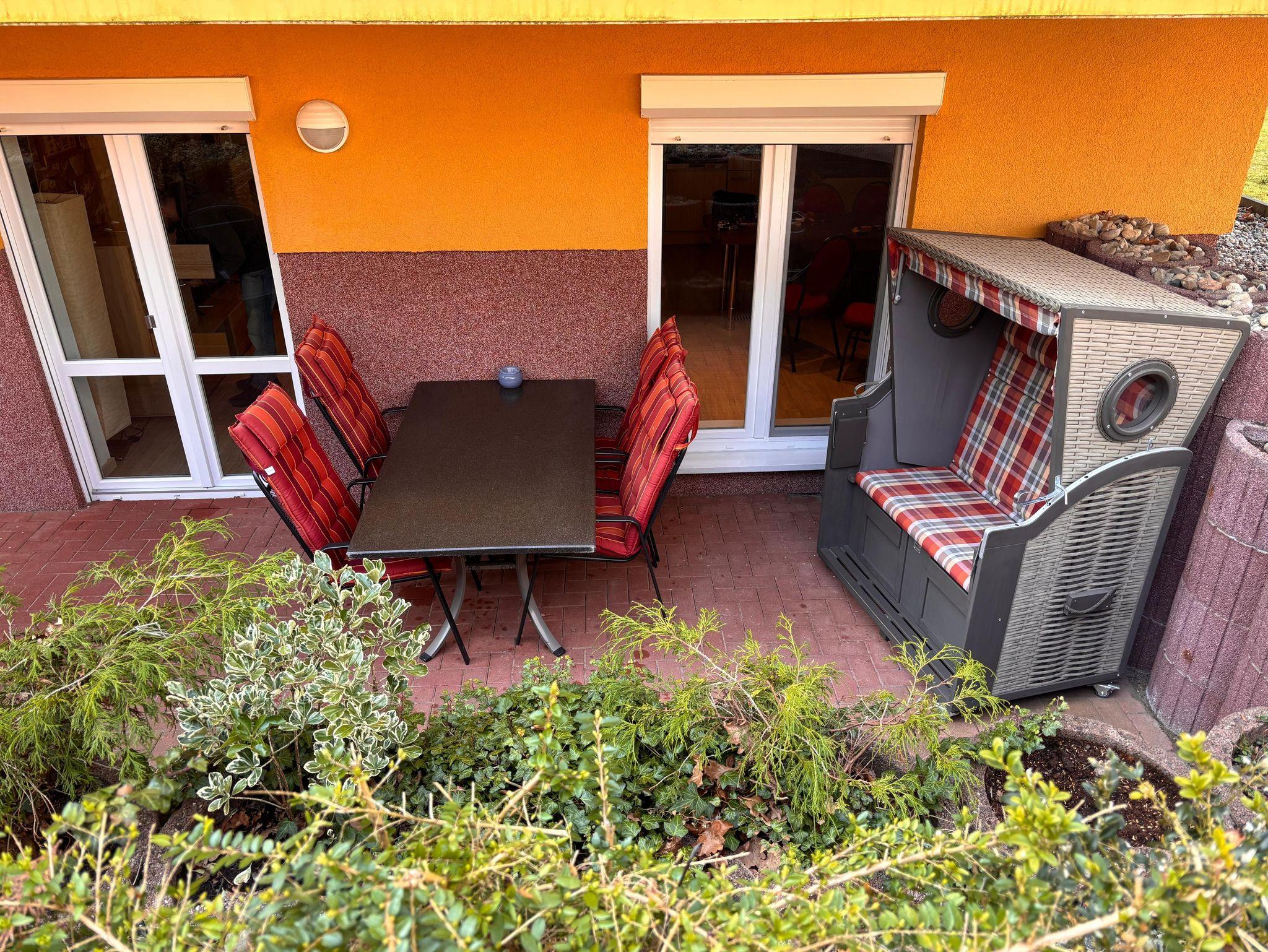 1 Terrasse mit Möbeln und Strandkorb