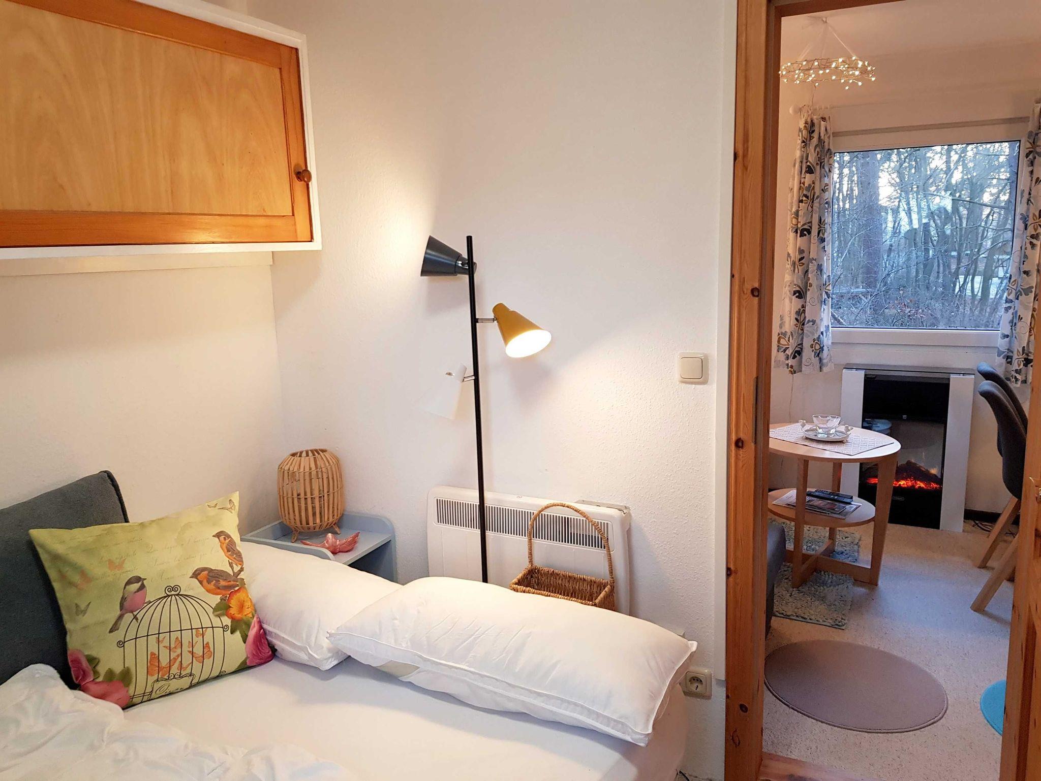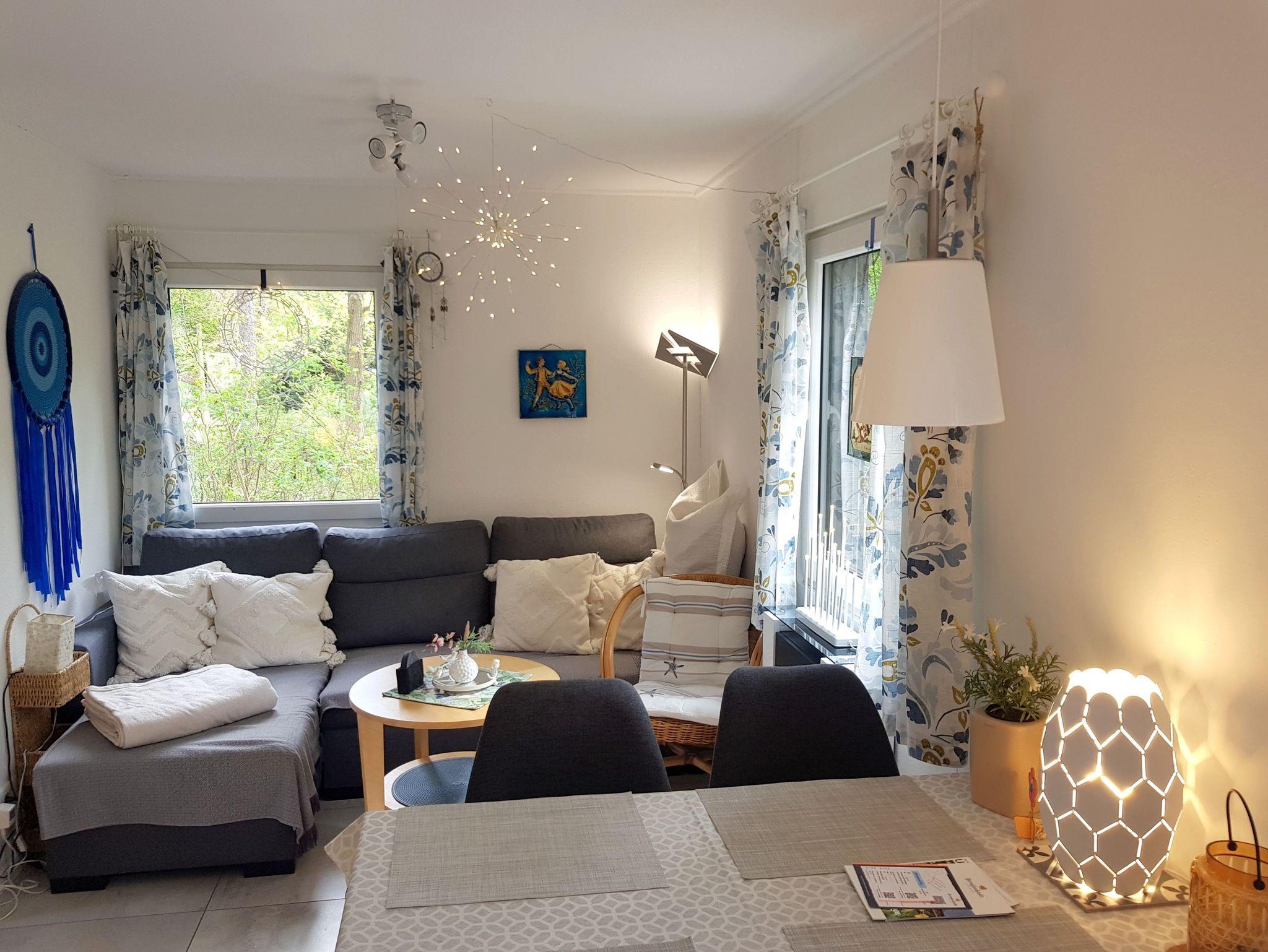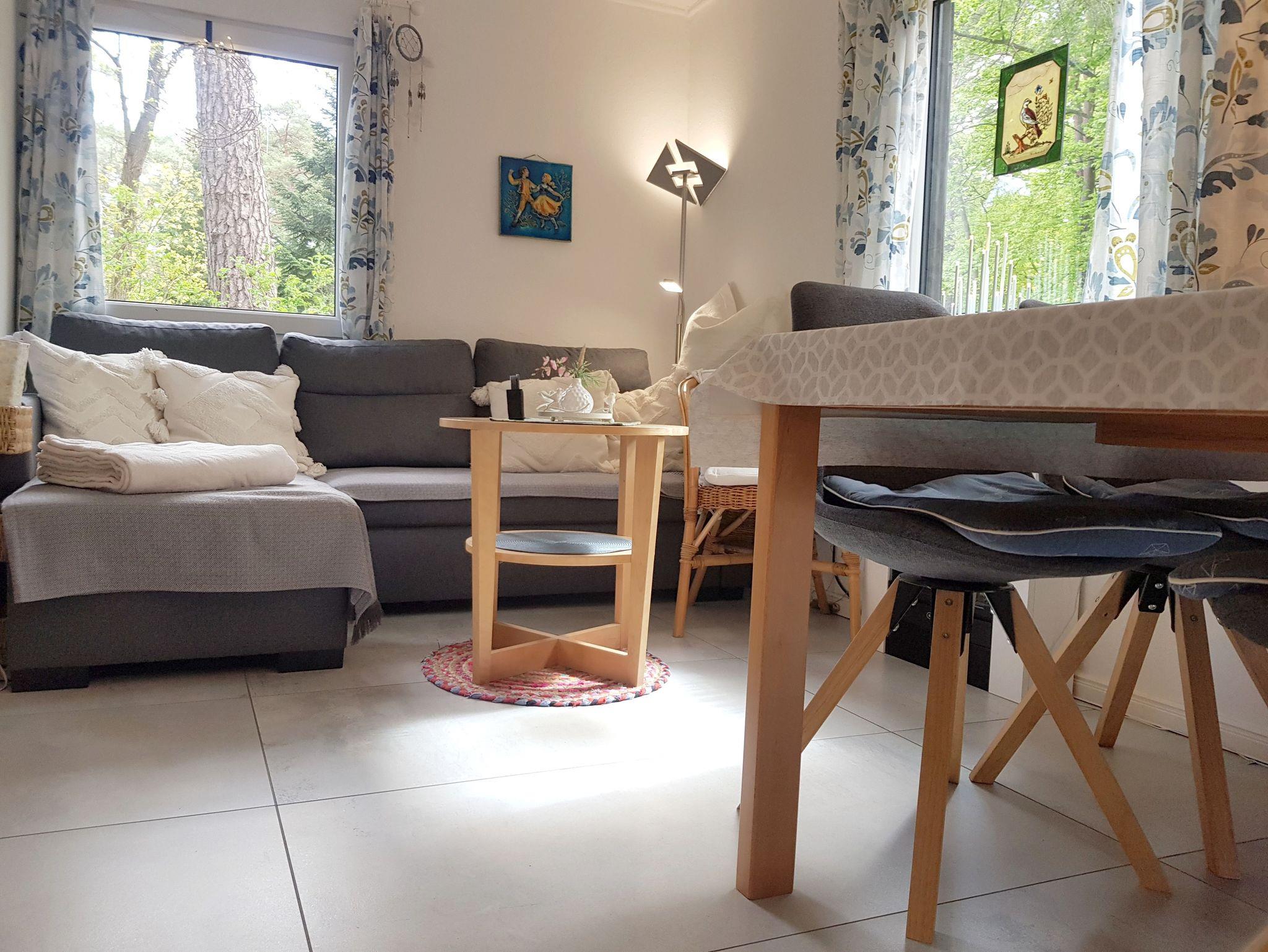 Im Wohnzimmer stehen eine gemütliche Sitzgarnitur sowie ein Esstisch für Sie bereit, Zugang zur Terrasse vom Wohnzimmer. Von allen Zimmern des Hauses blicken Sie auf die grüne Umgebung des Küstenwaldes. Ein elektrisches Kaminfeuer mit tollem Flammeneffekt sorgt für eine kuschelige Atmosphäre.
