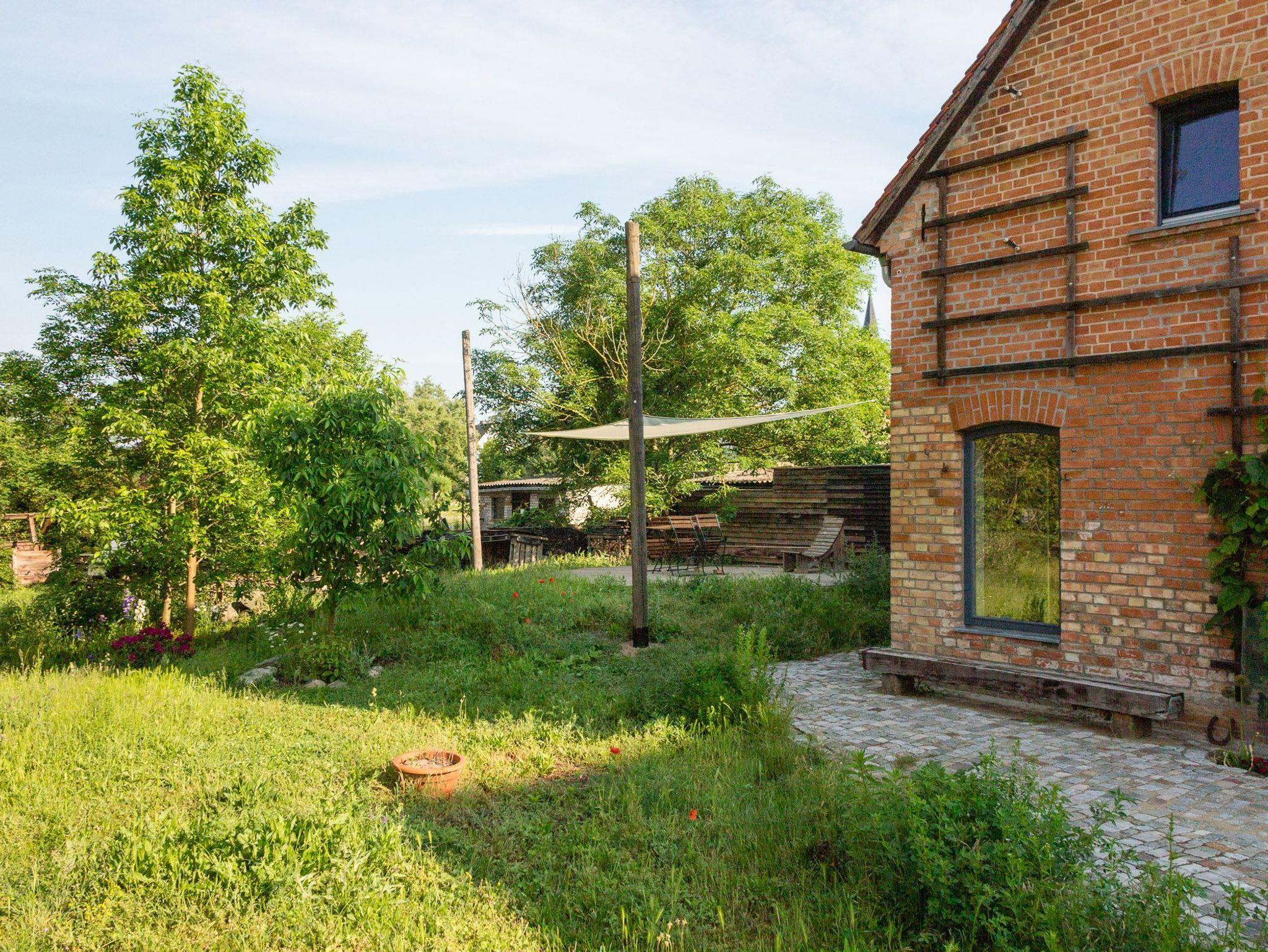 Das zweistöckige Ferienhaus aus vor Ort gebrannten Ziegeln (Steutz hatte früher zwei eigene Ziegeleien) liegt etwas in der Tiefe des Grundstückes im etwa 3000 qm großen Garten, der unmittelbar in die Auenlandschaft übergeht.