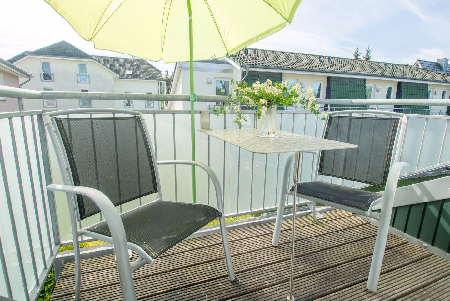 Die Wohnung liegt in der 1. Etage, hier finden Sie den hellen Wohnbereich mit der integrierten Küchenzeile und dem Zugang zum möblierten Westbalkon.