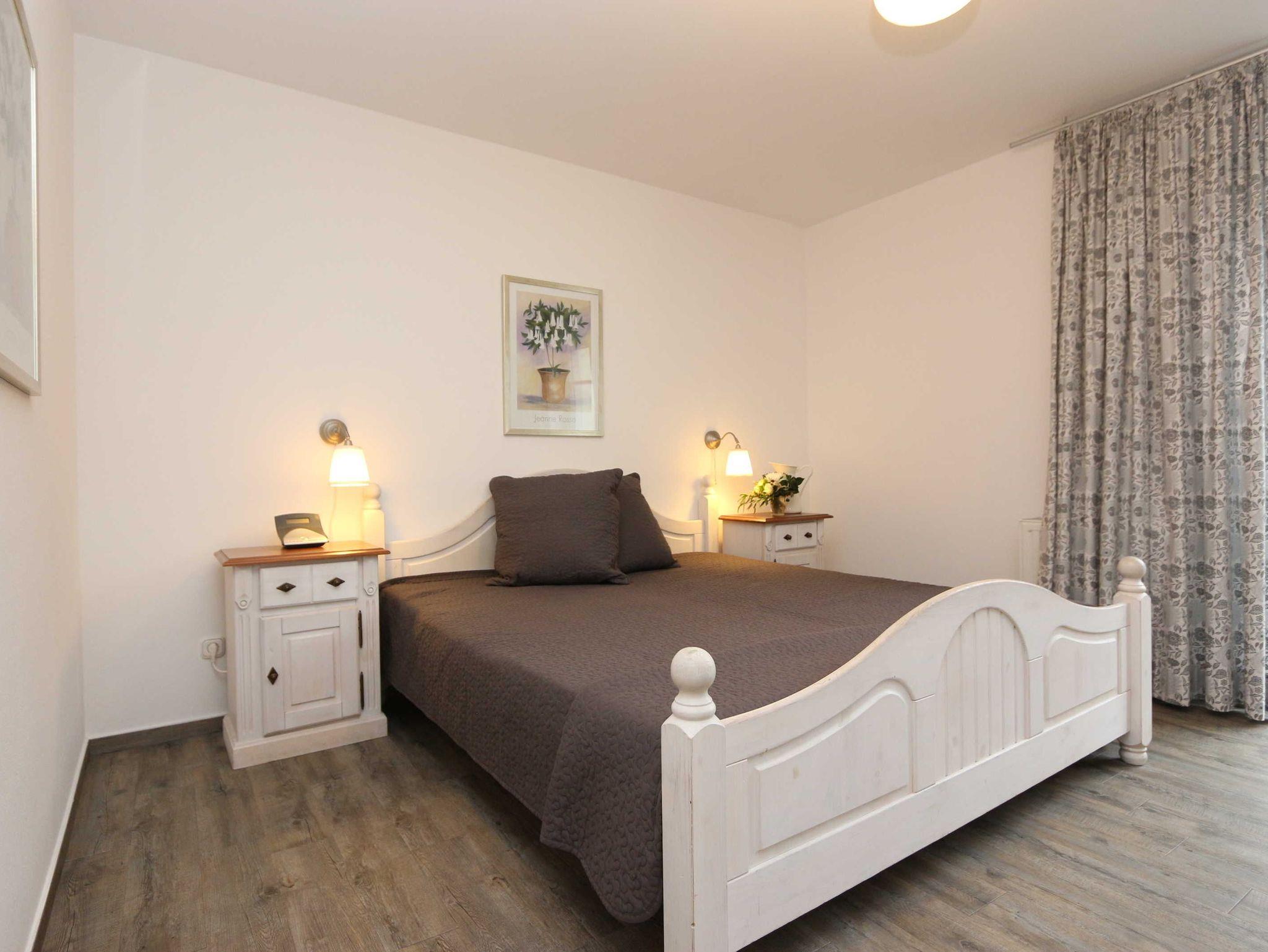 • Ein Schlafzimmer mit einem Doppelbett (ca. 1,80 x 2,00 m), einem großen Kleiderschrank, einer Komode und einer Musikanlage.
