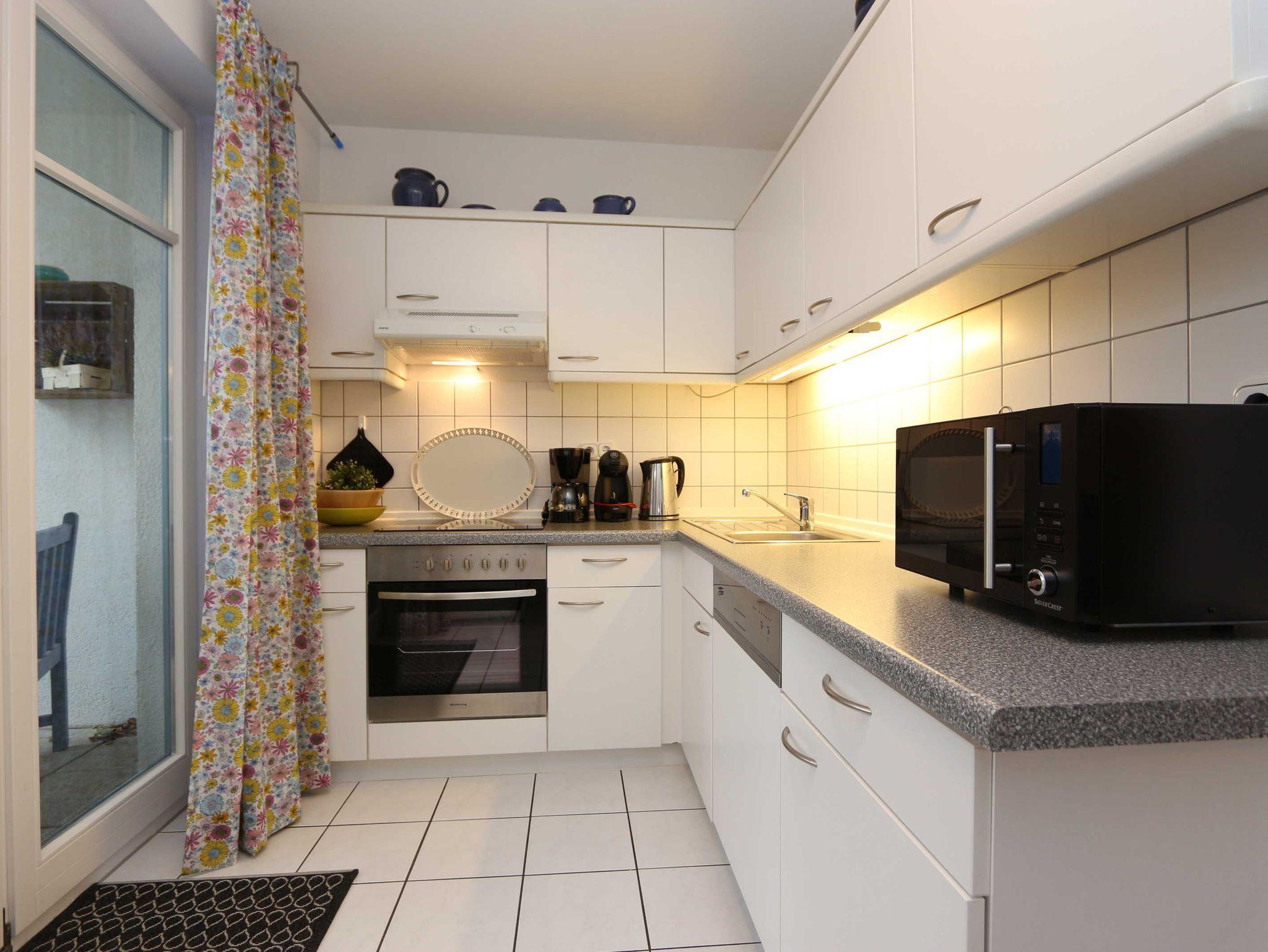 • Die komplett eingerichtete Einbauküche ist mit allem notwendigen für einen Urlaub ausgestattet und mit Zugang zur Terrasse. Dazu gehört ein Backofen, Herd, Kühlschrank mit Eisfach, Mikrowelle, Kaffeemaschine, Wasserkocher, Eierkocher, ausreichend Geschirr etc und eine Kapsel - Kaffeemaschine..