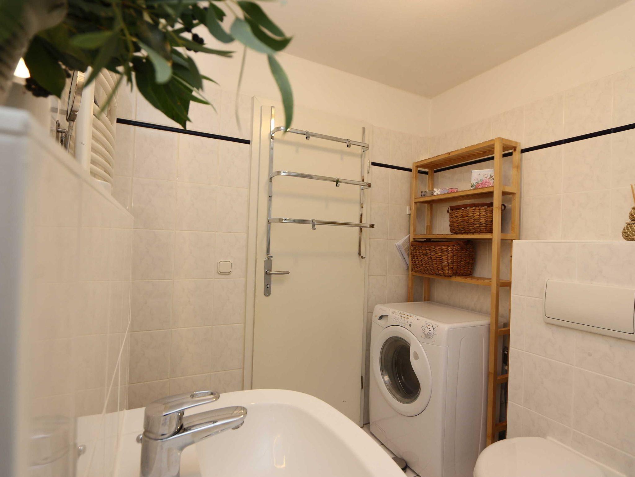 • Ein Badezimmer mit Badewanne, WC, Waschbecken, Handtuchtrockenheizkörper und Waschtrockner.