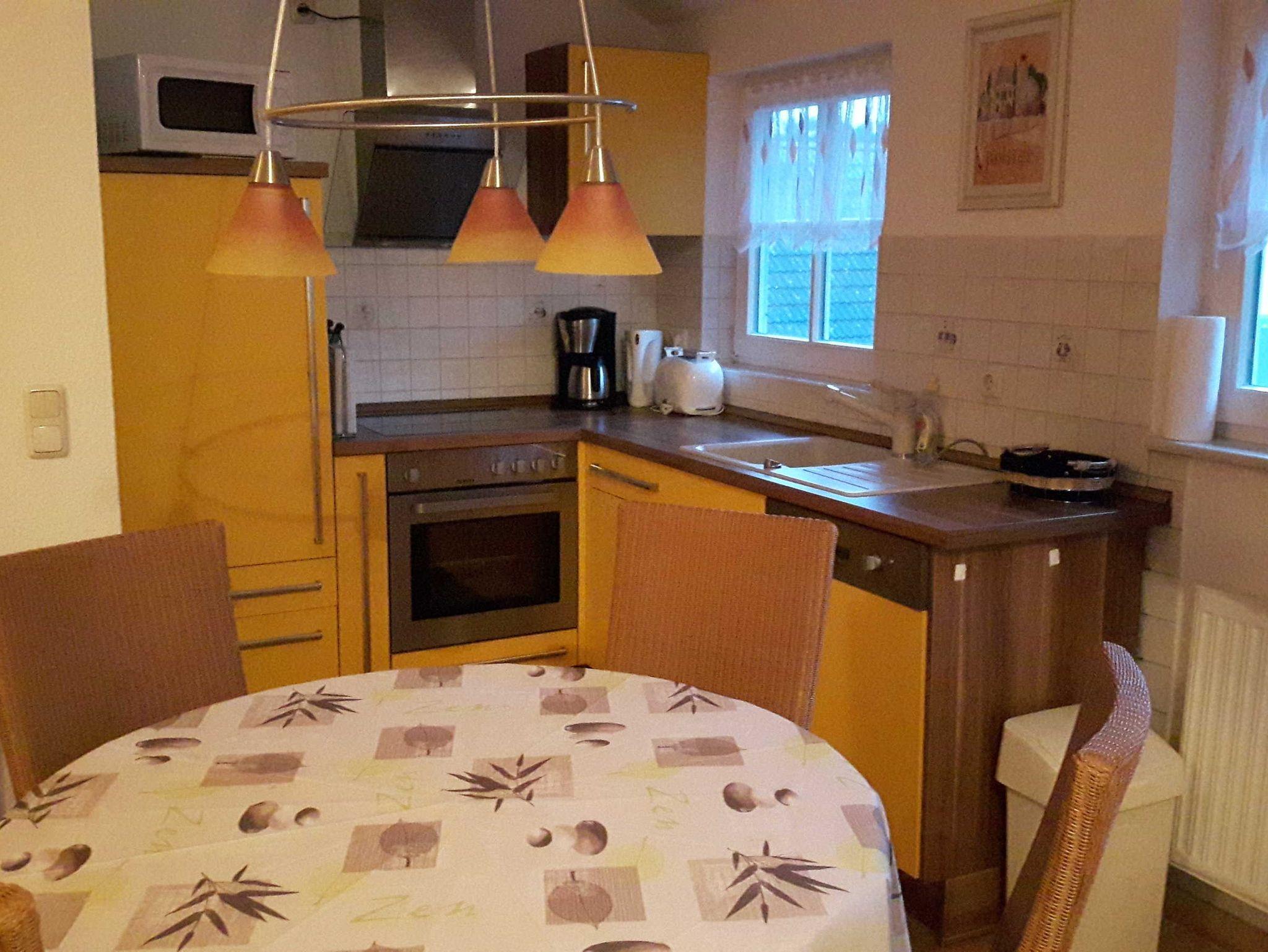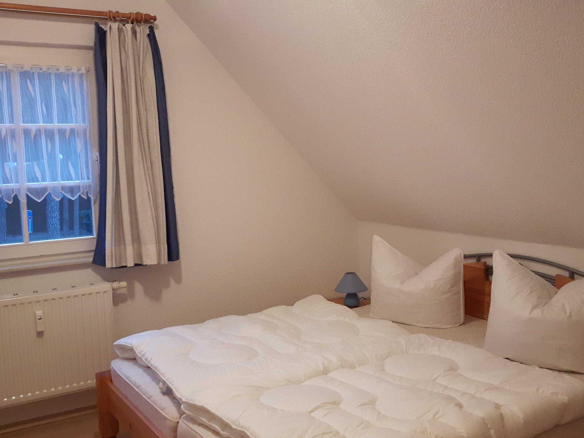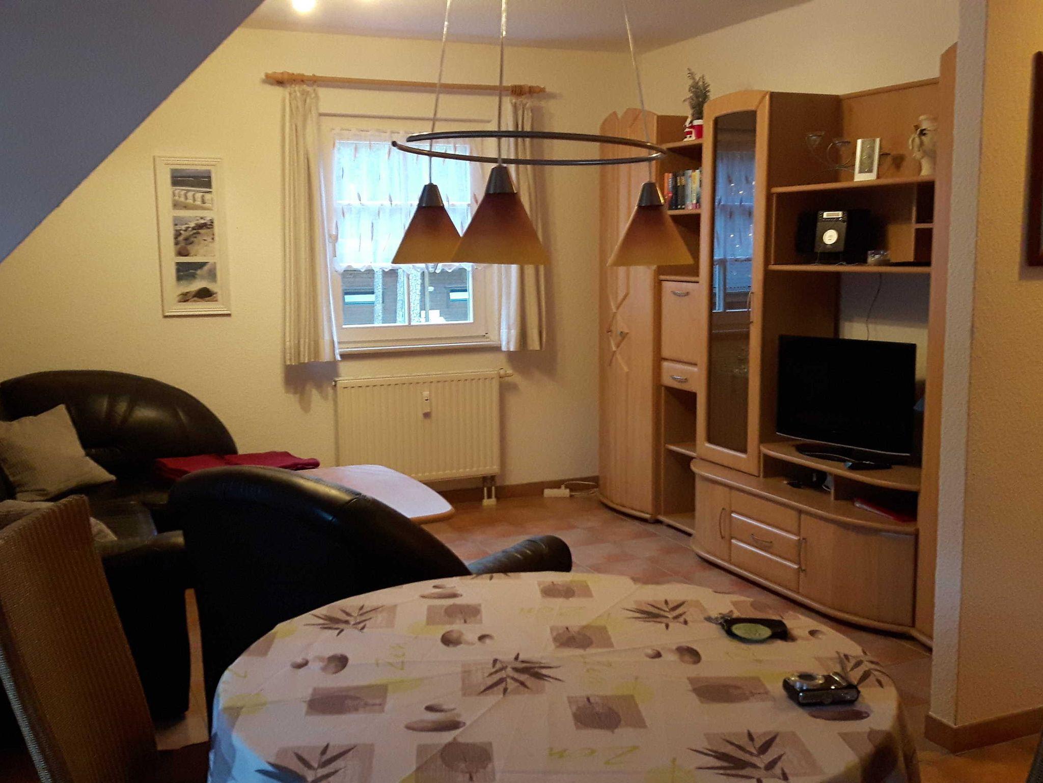 Freundliche 2-Zimmer Dachgeschosswohnung in einer liebevoll angelegten kleinen Ferienanlage. Die Ferienwohnung ist im Wohnbereich ausgestattet mit einer gemütlichen Couch mit Schlaffunktion, Flachbild-TV, Radio mit CD-Player, DVD Player und einer offenen gut ausgestattete Küche mit Essbereich. Im Garten gibt es einen möblierten, gemütlichen Sitzbereich.