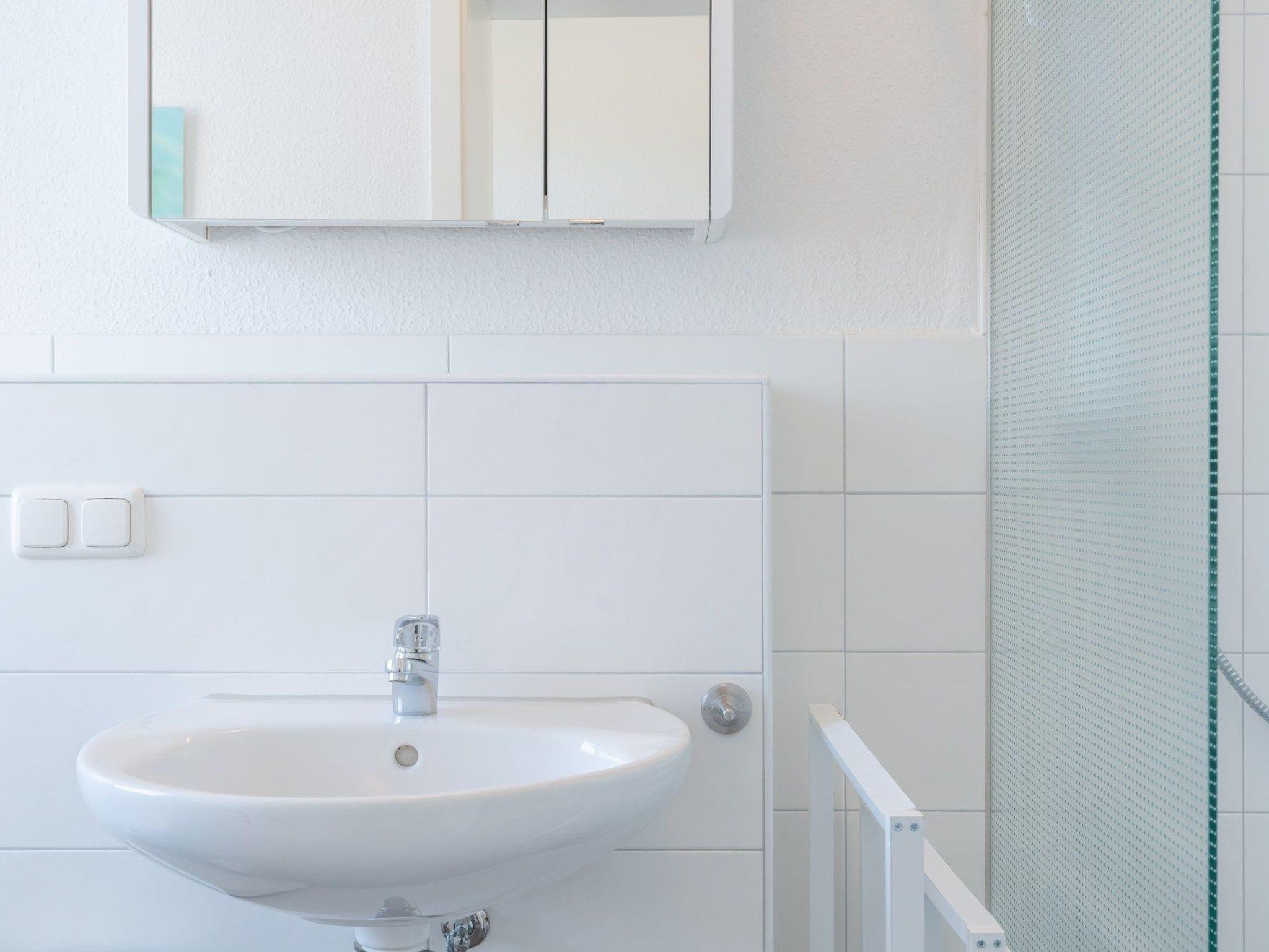Das Badezimmer verfügt über eine Dusche (mit Absatz) und WC.