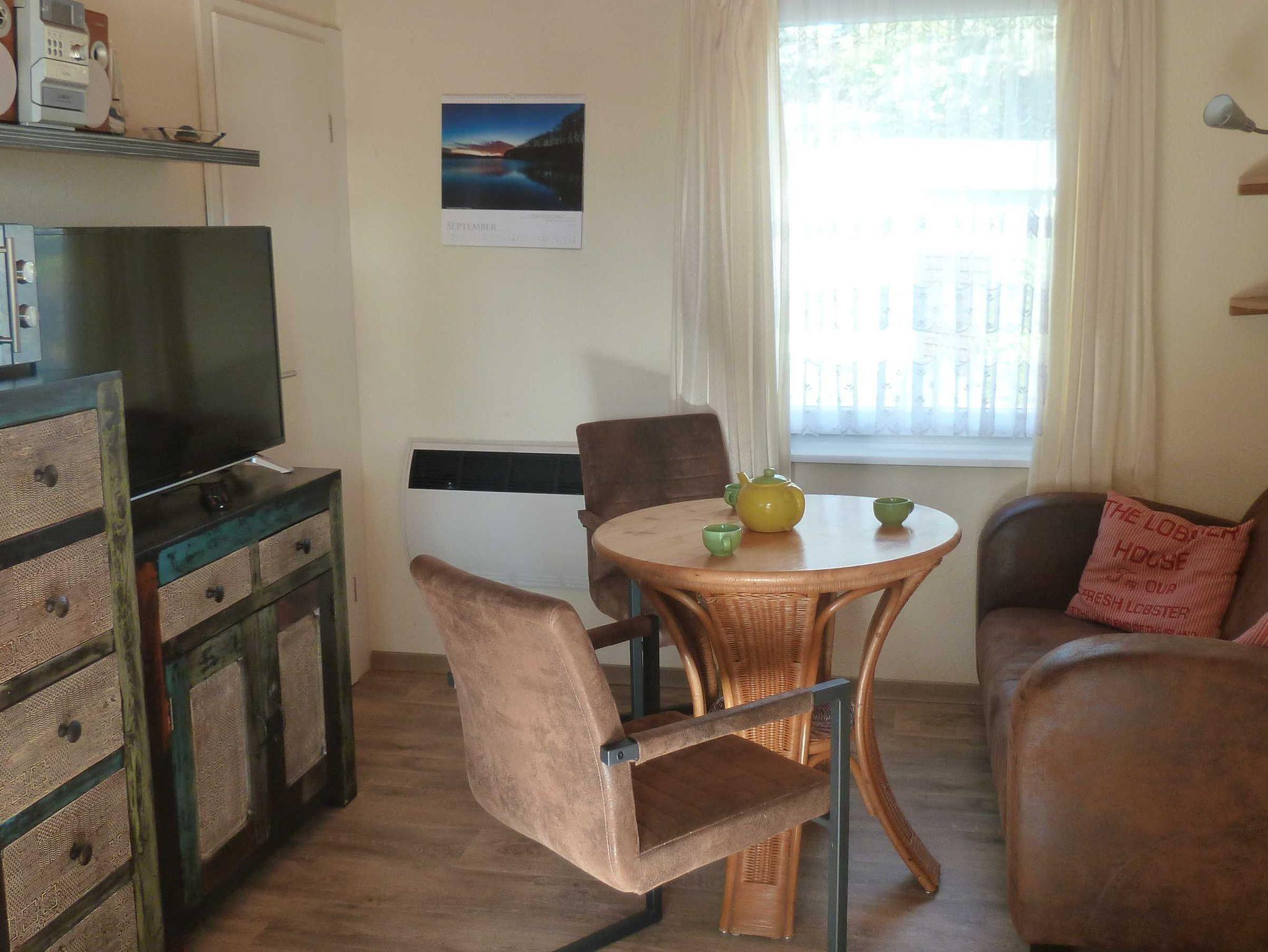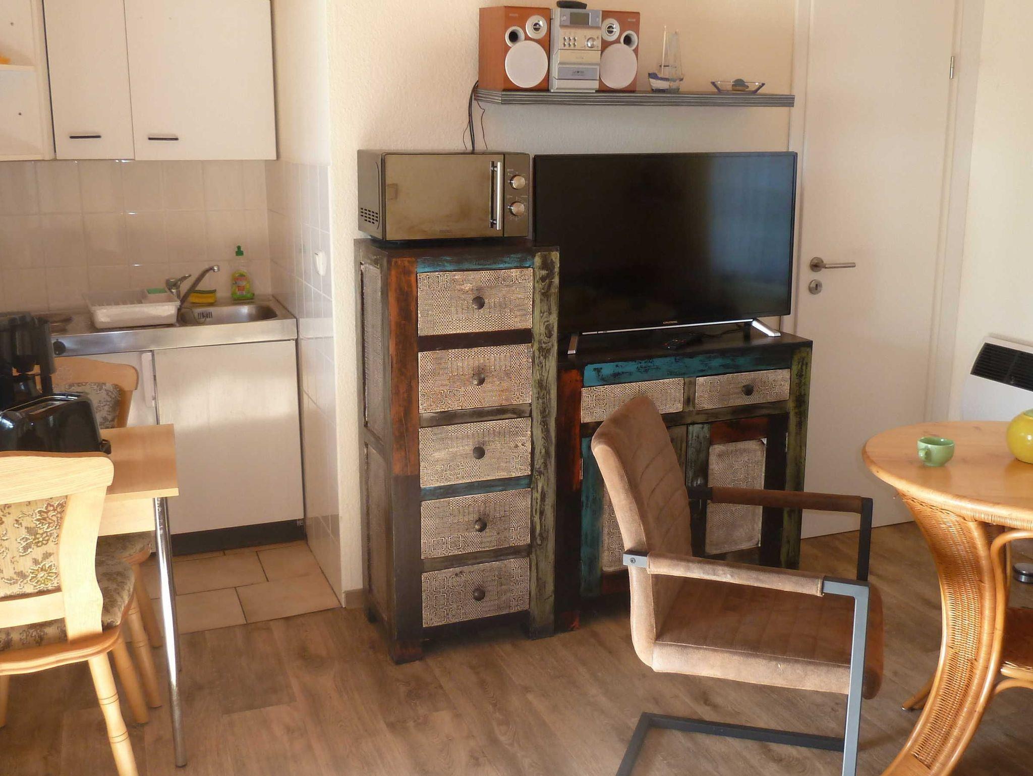 gut ausgestattete Pantryküche mit Herd, kleinem Backofen (für Pizza o. Brötchen), Wasserkocher, Gläser, Geschirr, Besteck, Kaffeemaschine, Mikrowelle, Toaster, Kühlschrank, Staubsauger, 40 Flachbild- TV, Radio, Fön, Hochstuhl, Gäste-Klappbett 191*0,96 cm und rundum Außenjalousien