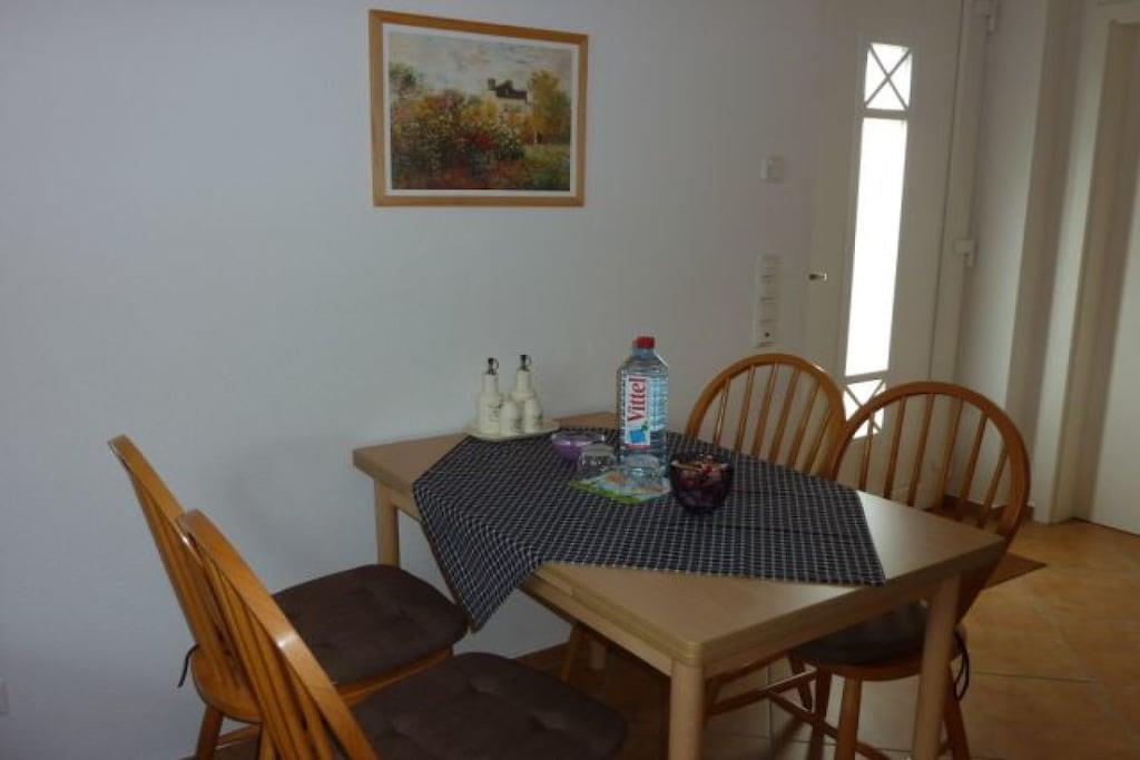 Wir vermieten ganzjährig unsere liebevoll eingerichtete 45 m² große Ferienwohnung für max. 3 Personen. Sie hat einen separaten Eingang und besteht aus einem Wohnraum mit Küchenzeile( Zwei-Platten-Herd, Kühlschrank, Mikrowelle, Kaffeemaschine, Toaster, Wasserkocher, Minibackofen) einem Bad mit Dusche und WC sowie einem Schlafzimmer mit Doppelbett und Einzelbett. Eine kleine Terrasse mit Gartenmöbeln und Grill ist vorhanden, ebenso ein Internetanschluss. Auf Wunsch stehen ein Kinderbett sowie ein Kinderstühlchen kostenfrei zur Verfügung.