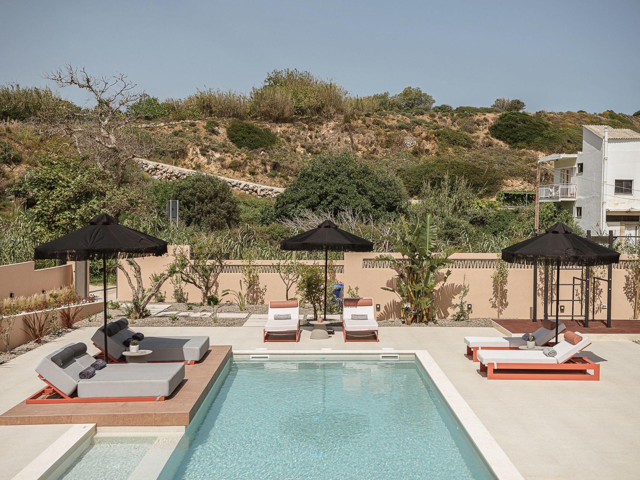 On the ground floor, you will find two bedrooms, one has an ensuite bathroom and views of the sea from the balcony, something that will attract your attention. The villa on the ground floor is completed with an open-air living space and a highly equipped kitchen that makes cooking meals worth trying. Sink into the comfy sofa and enjoy a cozy night while watching your favourite series, or gather around the dining area and raise a glass of wine while you get to enjoy a good-spirited dinner! The access to the exterior area and the pool is pretty easy from the dining area, with the large window doors making a seamless transition giving you the chance to enjoy the direct connection with nature.