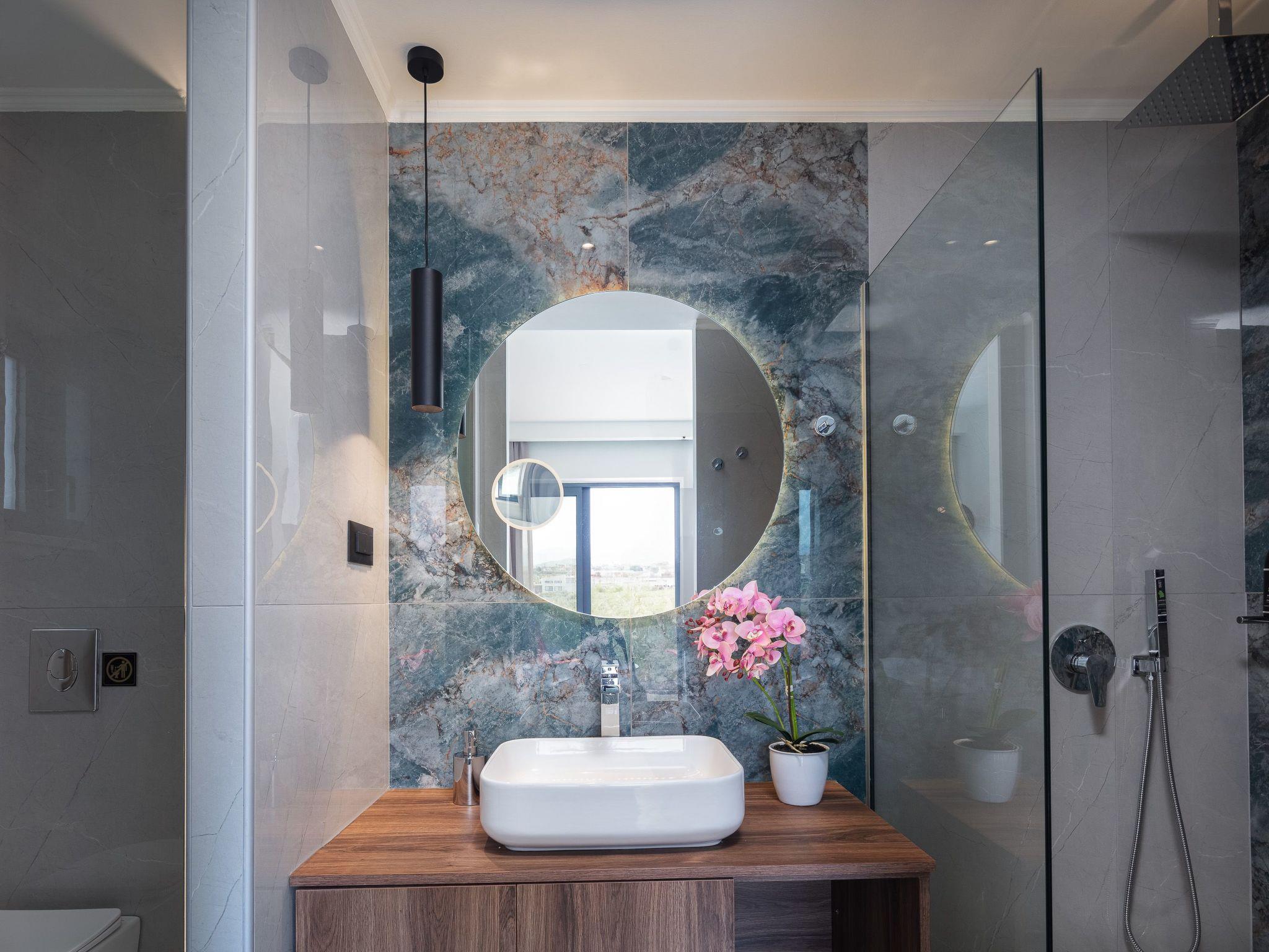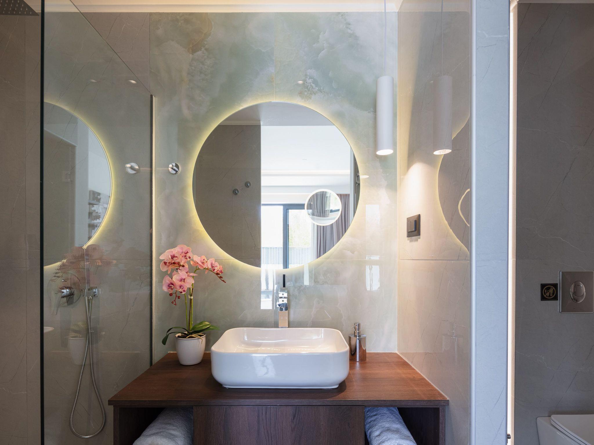 On the same level, Bedroom 1 offers a king-size bed (1.80 x 2.00m) with a high-quality Coco-Mat mattress, air conditioning, a 44’’ Smart TV, an ensuite bathroom with a walk-in shower, and direct access to the pool.