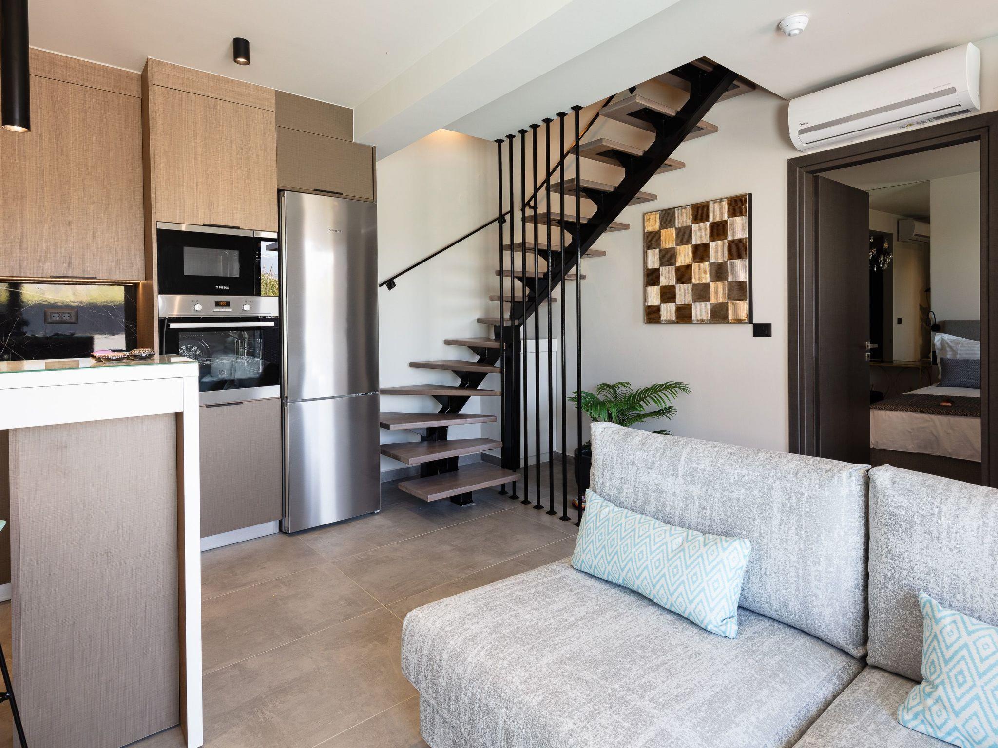 Spanning 75 sqm across two levels, VillAgioi Villa II can comfortably accommodate up to 5 guests. The ground floor features a bright open-plan living area with modern minimalist décor, a cosy seating corner, Smart TV, and wide sliding doors that connect seamlessly to the private pool area. The fully equipped kitchen includes stainless steel appliances and a convenient breakfast bar for casual meals.