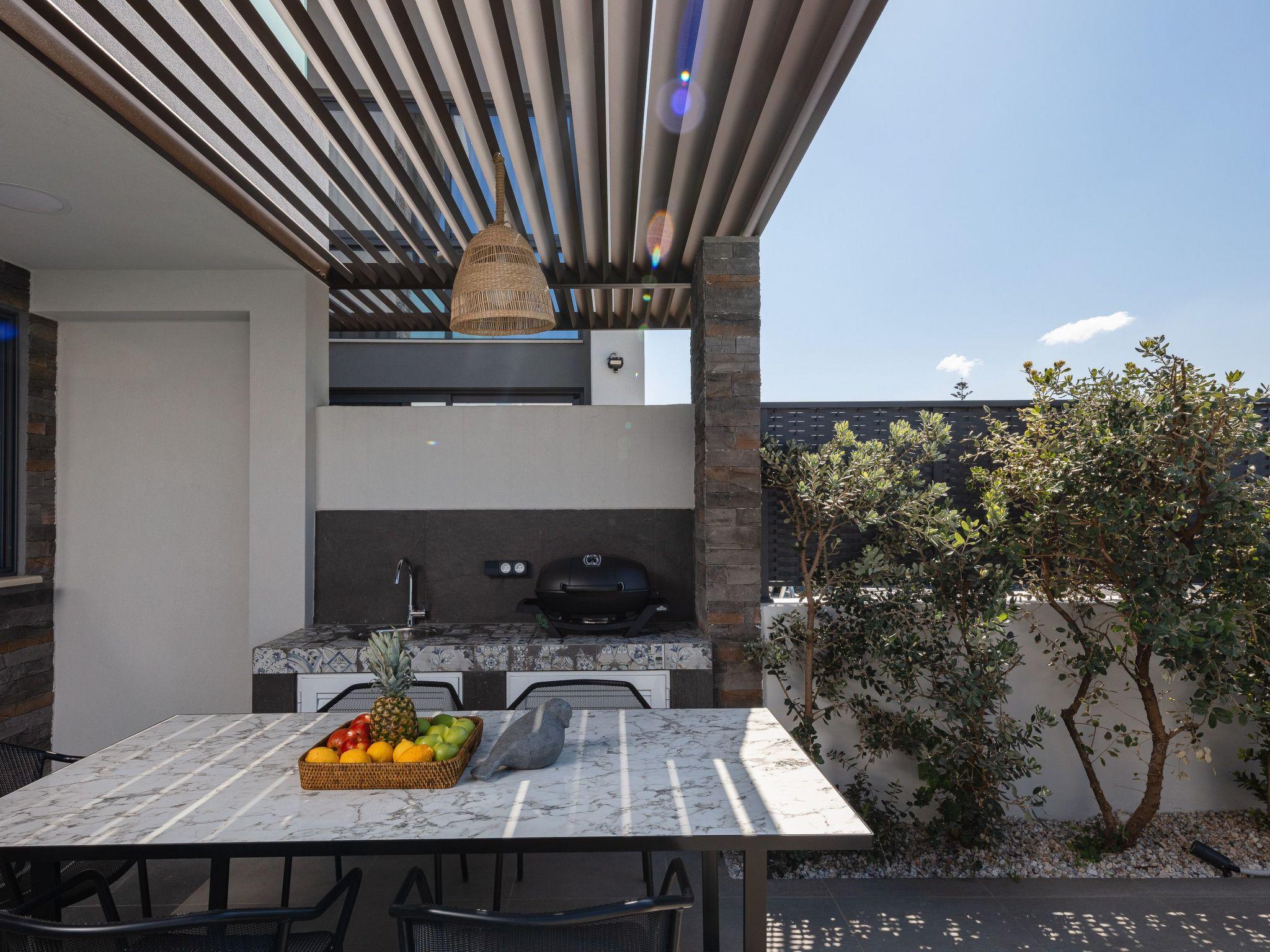 The outdoor area of VillAgioi Villa II has been thoughtfully arranged to provide a private and serene retreat. The 25 sqm private swimming pool is complemented by a poolside shower, sun loungers, and a shaded umbrella area. A fully equipped outdoor kitchenette with an electric BBQ and a large dining table makes it perfect for enjoying al fresco meals.