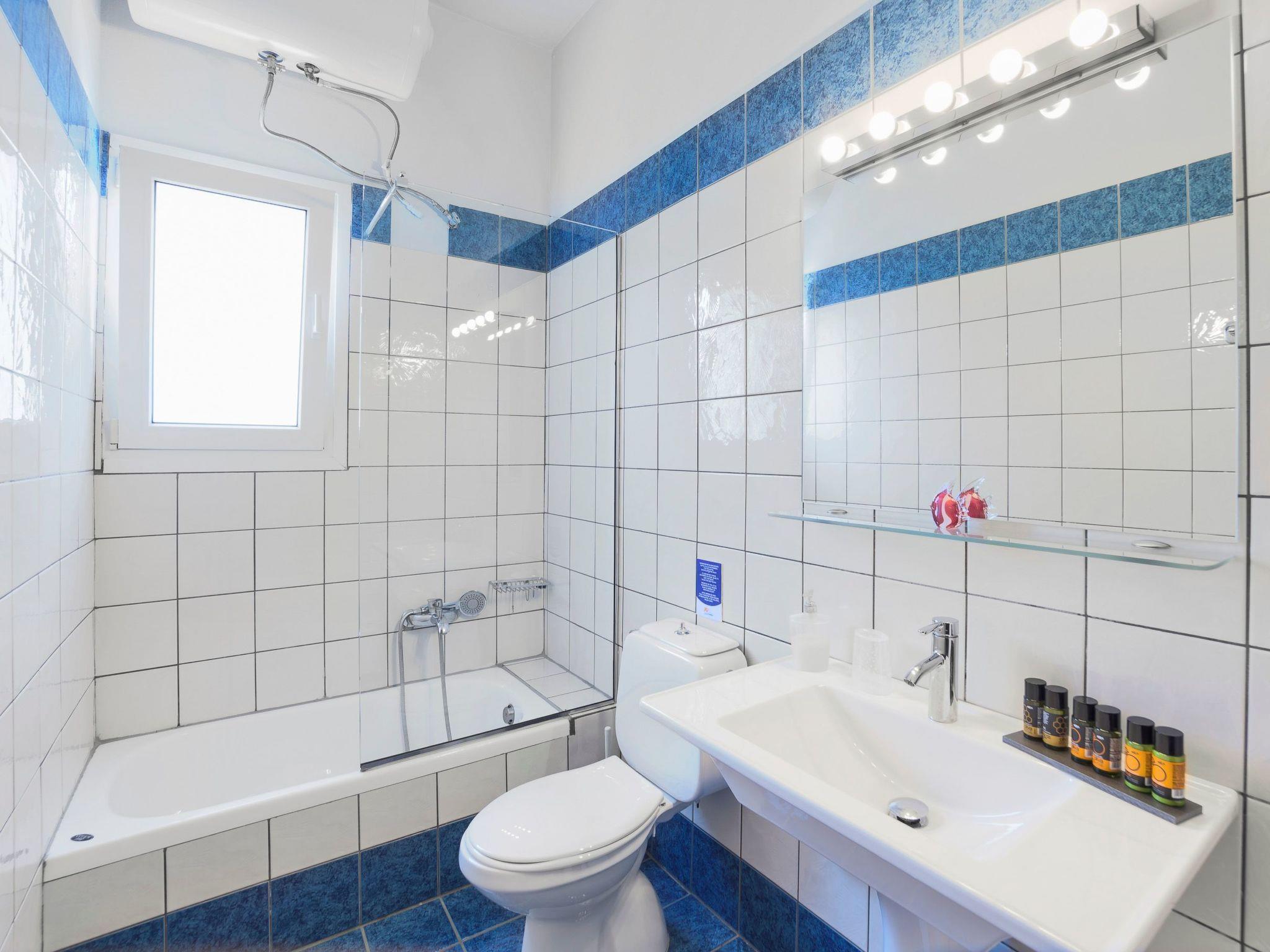 The second bedroom has two single beds and a big closet, too, and offers view to the mountains and to the pool area… There, umbrellas and lounge chairs are waiting for you, in order to give you a nice swimming alternative to the beach.
