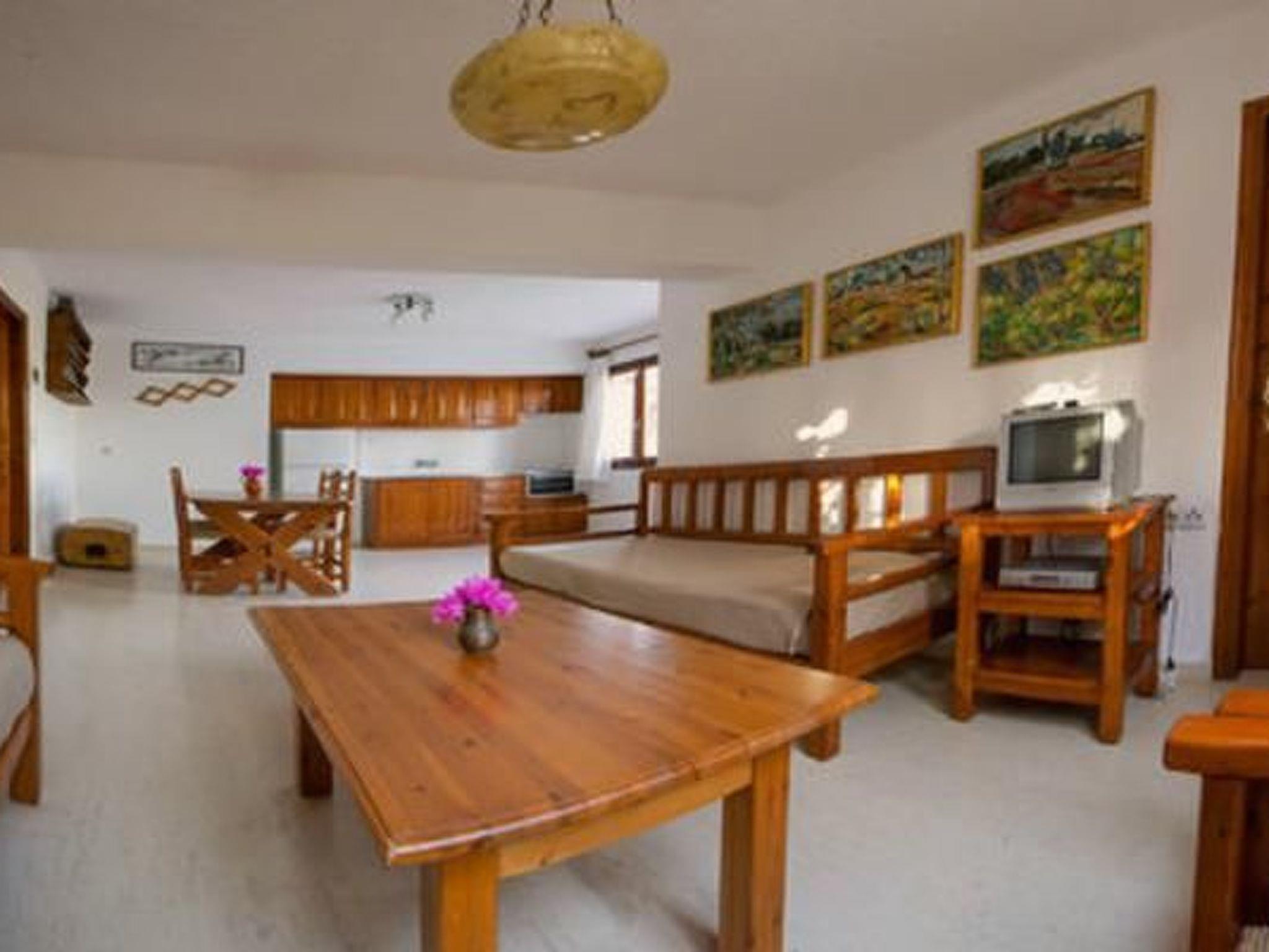 The furnishings in the house are made of solid wood, bathrooms and kitchen are tiled and all the floors are laid out with white marble. Every apartment includes a TV-set. In the garden you also find a grill area next to a stone built, traditional Greek oven in which bread can be baked as well as other typically Greek food. The adjoining marble table and benches invite you to rest and to enjoy the just prepared food under the shading trees caressed by the fragrant air. Another delight is the splendid view from up here to the Mediterranean Sea that will stay in your memory for a long time. Children can play freely on this enclosed property and romp the garden to their hearts content (a sandbox is also available for their use).