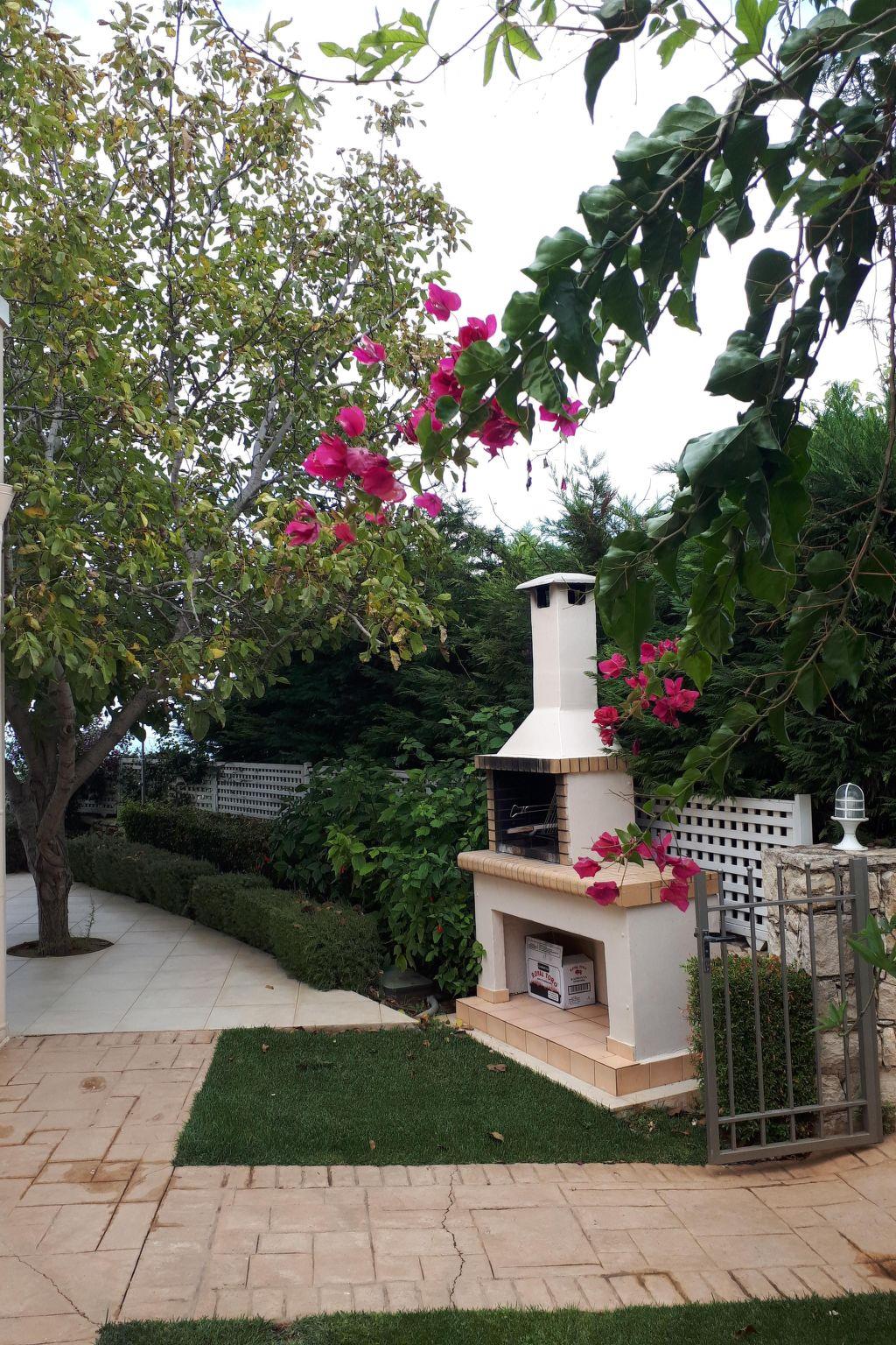 Further details concerning the outdoor space: Large sun terraces furnished with sun loungers and parasols surround the 6 x 4.5m swimming pool which is accessed by ladder steps. There is a poolside shower. There is a barbecue for the guests to prepare delicious meals where they can enjoy at the patio dining table and chairs, while watching over the mountains, the old village of Skouloufia and the sea. The area is pleasantly landscaped with lawn areas and citrus trees. There is a private parking in the outdoor space of the villa.
