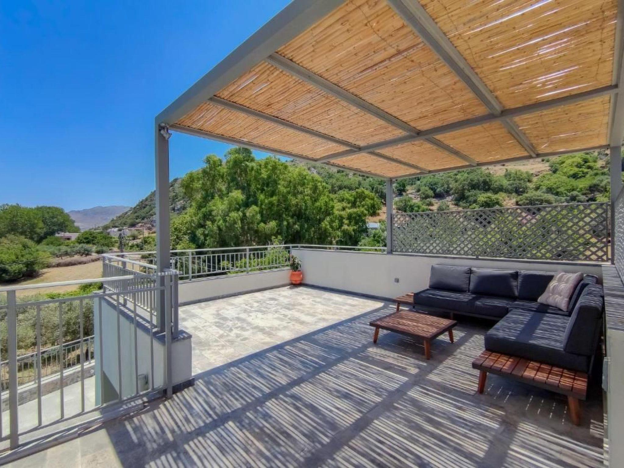 This new villa with a guest house and private pool is an impeccably designed villa and great care and can be seen in every detail. It is a high quality 3 bedroom villa with an independent guest house. Situated on the village of Kali Sykia, 8km from Plakias and can accommodate up to 8 people. It is quietly positioned and suitable for families and groups.Entering the villa, on the ground floor, there is a spacious open plan area consisting of the living room with a large sofa, fireplace, a TV, the dining area and a fully equipped kitchen of fixtures and appliances including. Additionally, a bathroom is found on the same floor. The open plan area opens the yard that leads to the pool area while has a fully equipped barbecue area.On the first floor there are three bedrooms and one bathroom. The first bedroom has a double bed, TV, air condition and a balcony overlooking the pool and the mountain. The second and the third bedroom have two single beds each one (that can be joined to one bed), a TV, air condition and balcony. Also, on this floor there is a large terrace with outstanding panoramic views.?Independent Guest HouseThe independent guest house is located next to the villa. The guest house consisting of a kitchen, a bedroom with two single beds and an en-suite bathroom with shower. Additionally, the house has direct access to the swimming pool.