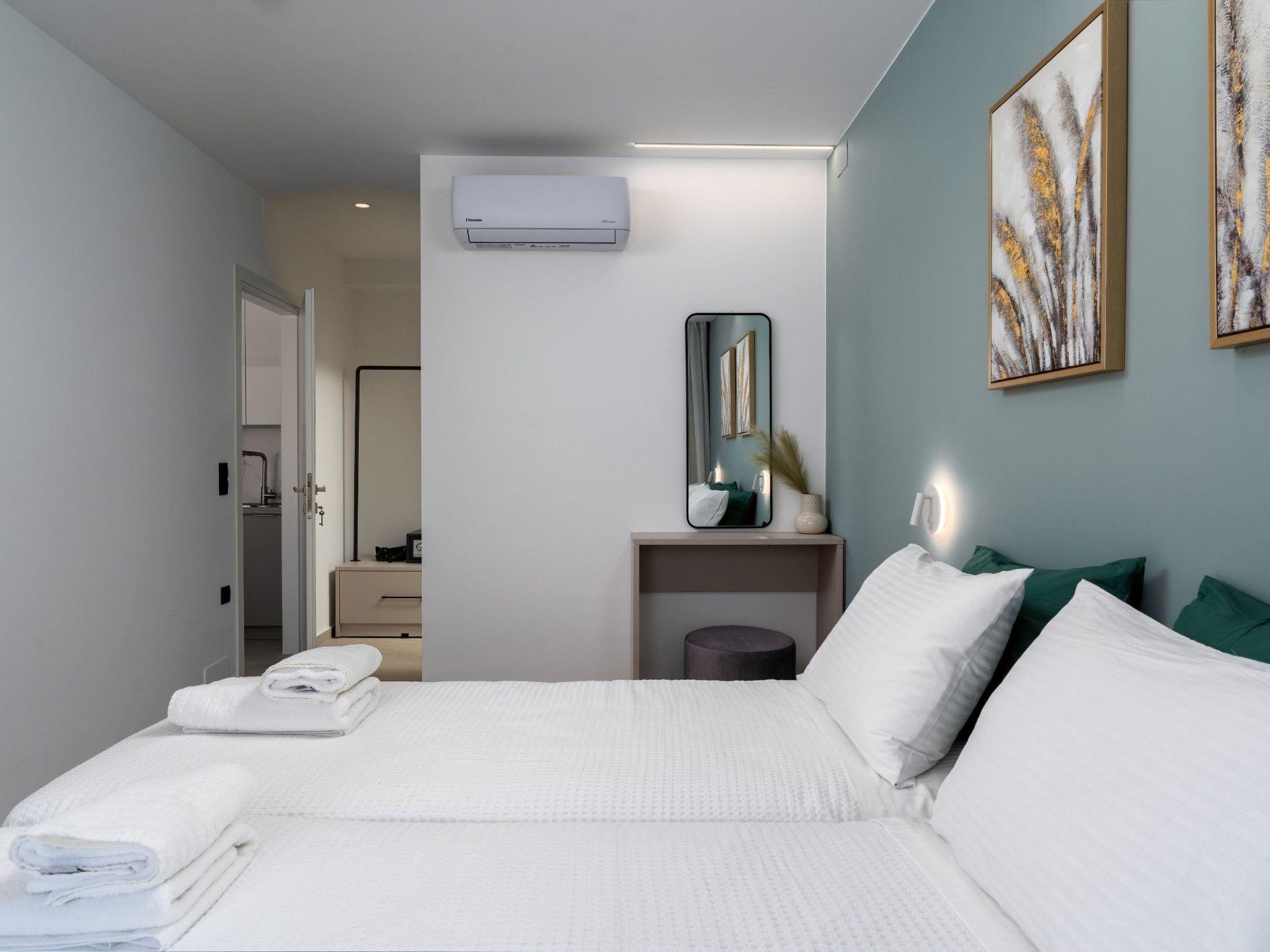 Upstairs, the master bedroom offers a double bed, a private balcony with sea views, an ensuite bathroom, and a satellite TV. The second bedroom has twin beds, its own ensuite, and satellite TV, making it ideal for friends or children. Additionally, foldable beds provide flexibility for larger groups or families.