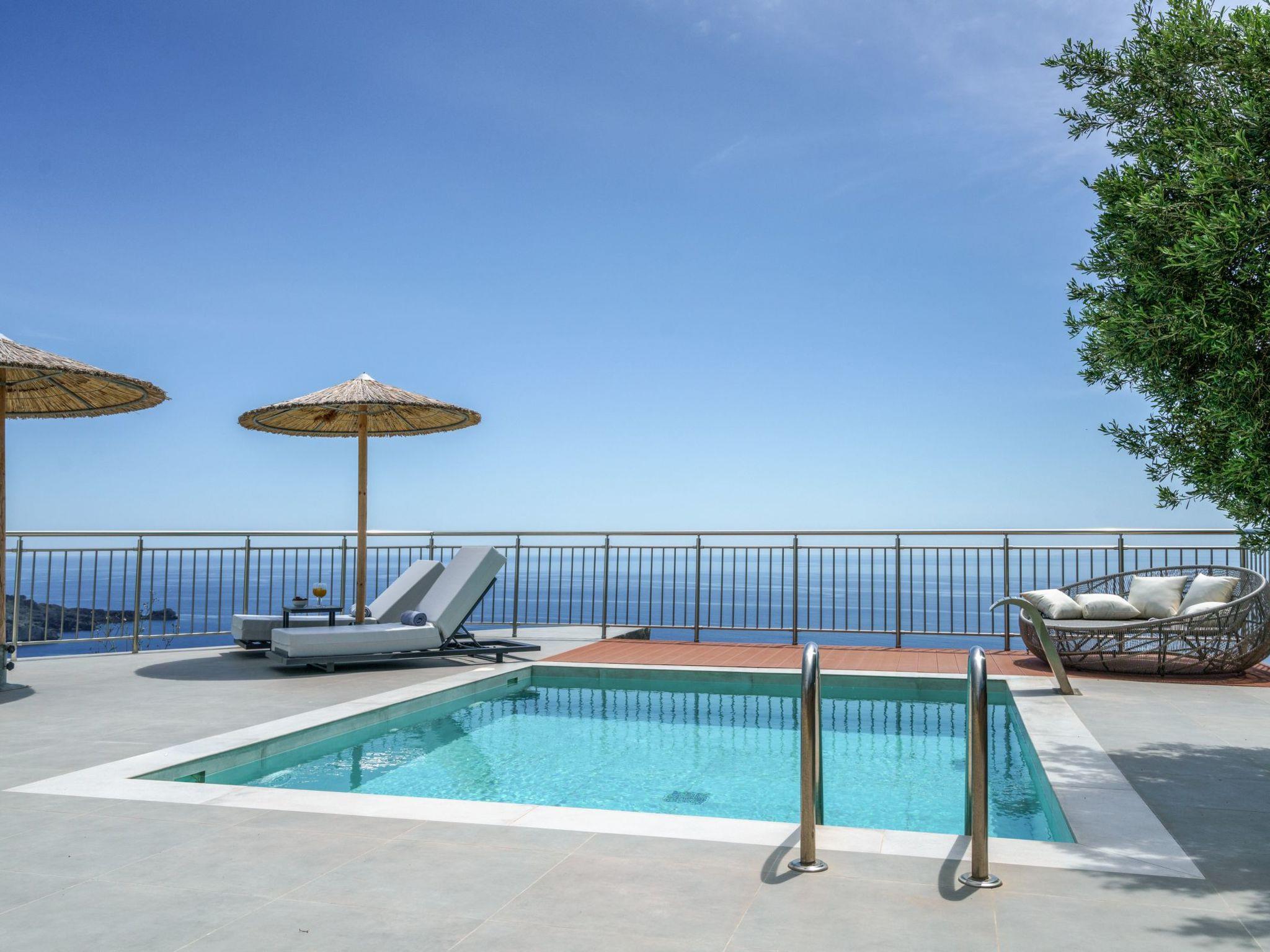 Guests can enjoy the stunning sea views and lush surroundings from the terrace. Outside, Villa Minoiko features a private garden oasis with a refreshing outdoor pool, an outdoor shower, and pool towels. A built-in BBQ area invites you to savor meals al fresco, complemented by outdoor seating and dining areas that capture the essence of Mediterranean living.