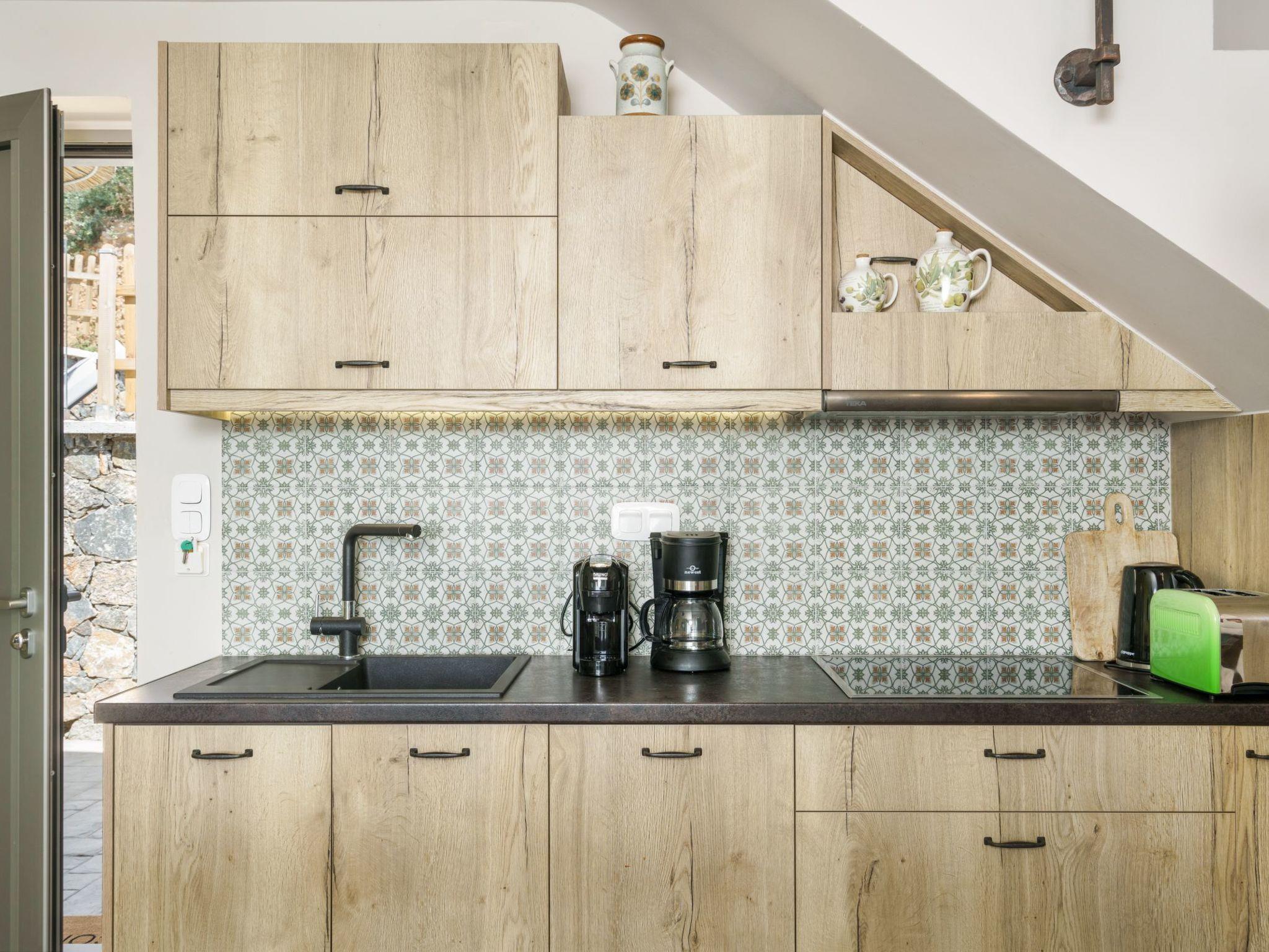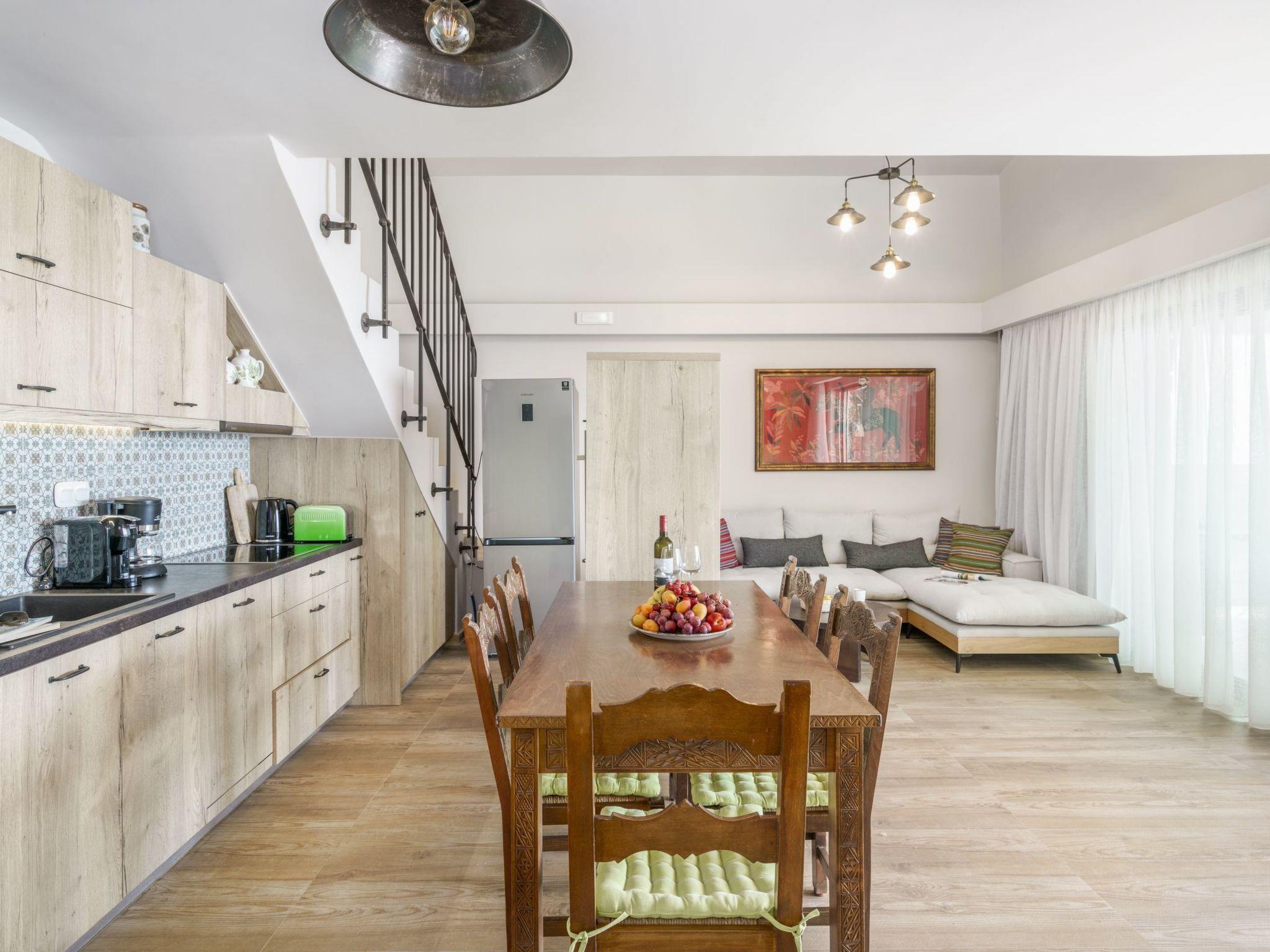 Part of the Ikones Kritis ("Vistas of Crete") three-building complex, Paradosiako ("Traditional") boasts a spacious living room with elegant furnishings and a cozy ambiance, perfect for unwinding after a day of exploration. The adjacent fully equipped kitchen features modern appliances like a stove, oven, dishwasher, and espresso machine, ideal for preparing gourmet meals to enjoy in the welcoming dining area. Guests are greeted with a thoughtful welcome pack, and cleaning and laundry services ensure a hassle-free stay.