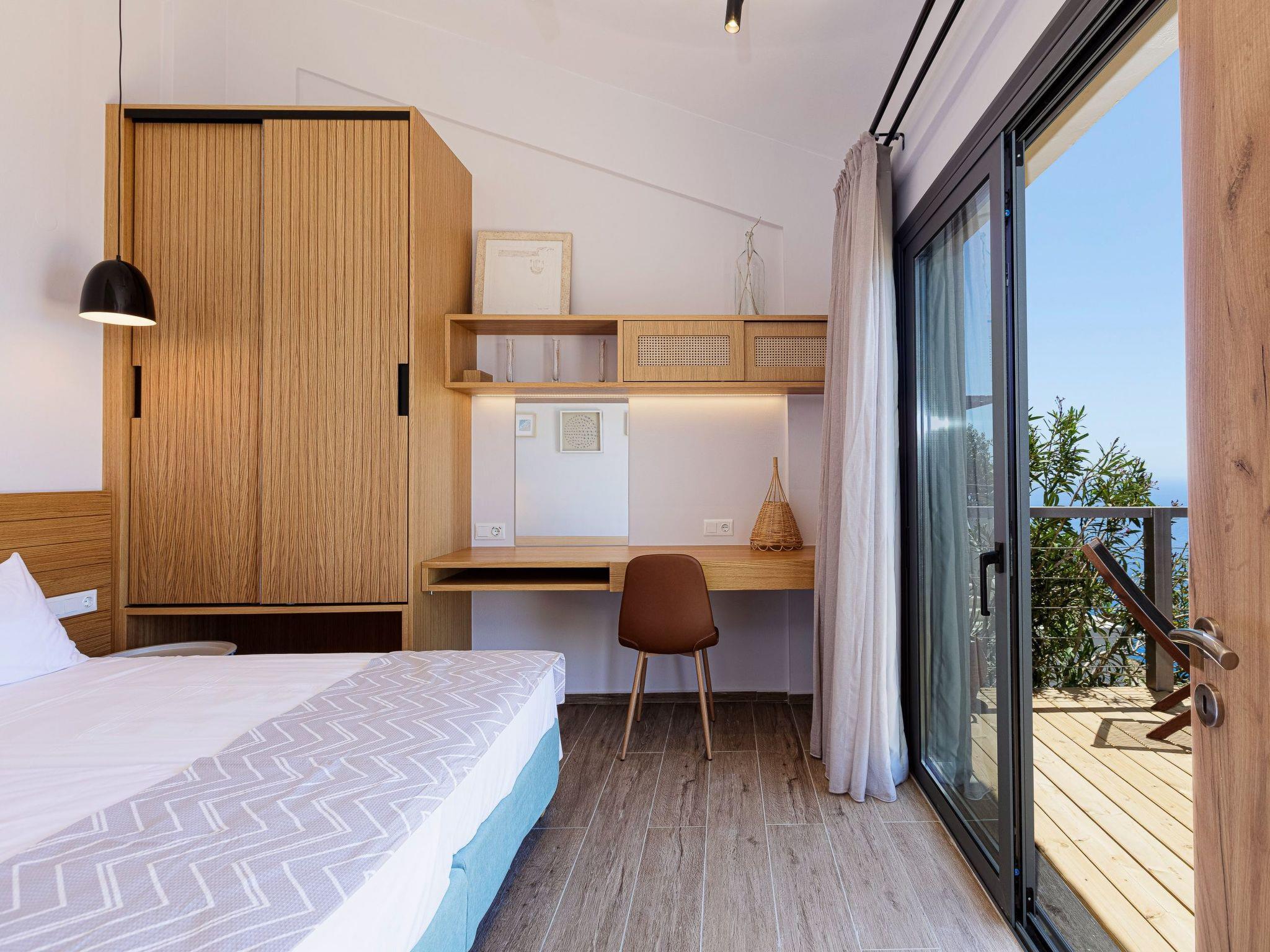 Each villa, spreading over two floors and covering 112 sqms, can comfortably accommodate up to 5 persons. The interior design exudes luxury, with every room facing the sea to ensure that guests can always enjoy the dramatic scenery of South Crete. Tastefully decorated, the villas provide all necessary amenities for a holiday marked by comfort and luxury, including privacy in their sea-view verandas, large balconies, and private swimming pools, all within their own expansive garden-areas.