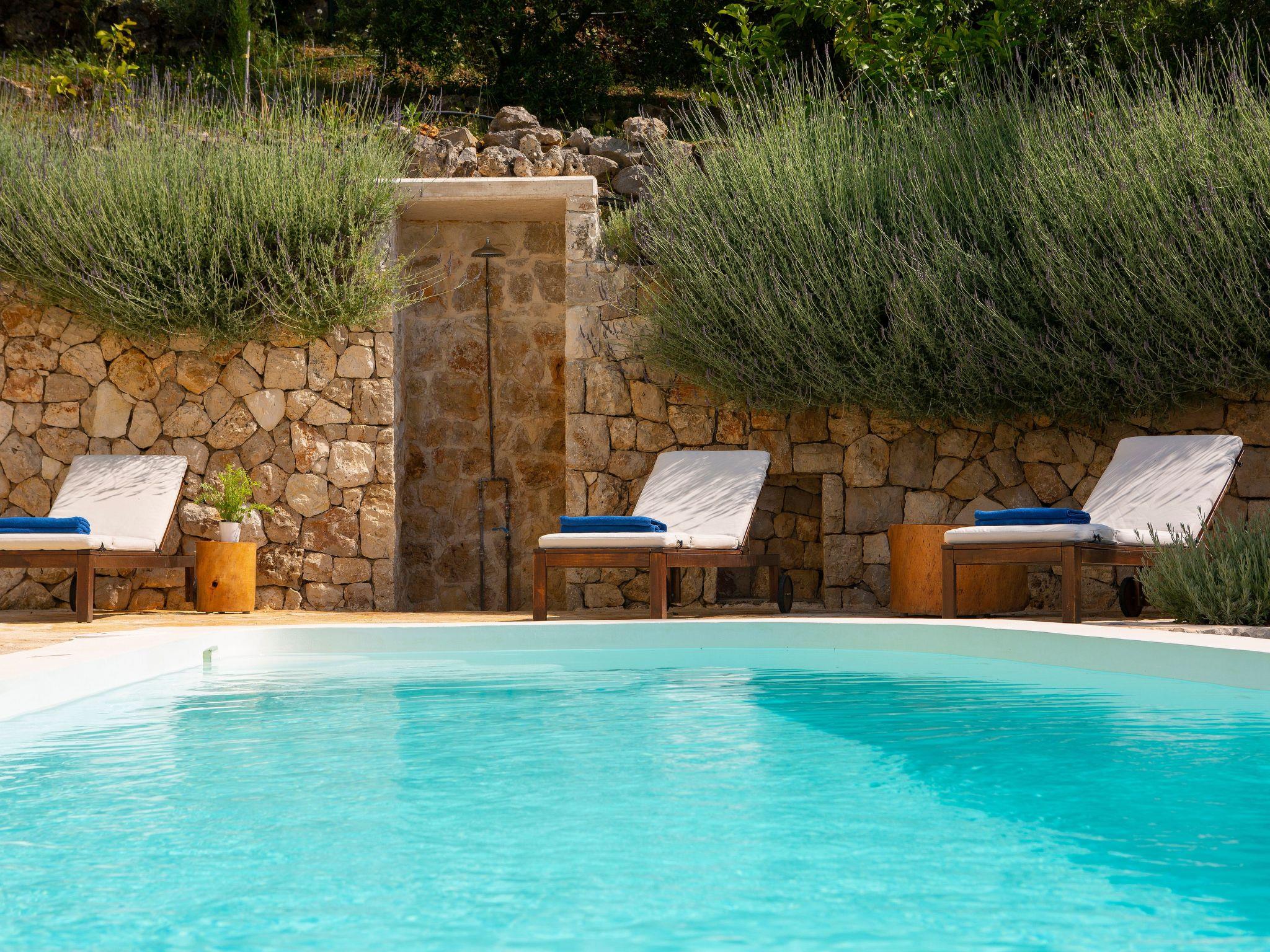 Chlorine free pool with salt ideal for childrenWooden sun bedsPool towelsVeranda overlooking the Ionian SeaHerbal gardenVegetable gardenOutdoor barbequeOutside living areaDining areaYoga deck (Blueboo)Outdoor showers with warm and cold waterAdditional services (upon request)