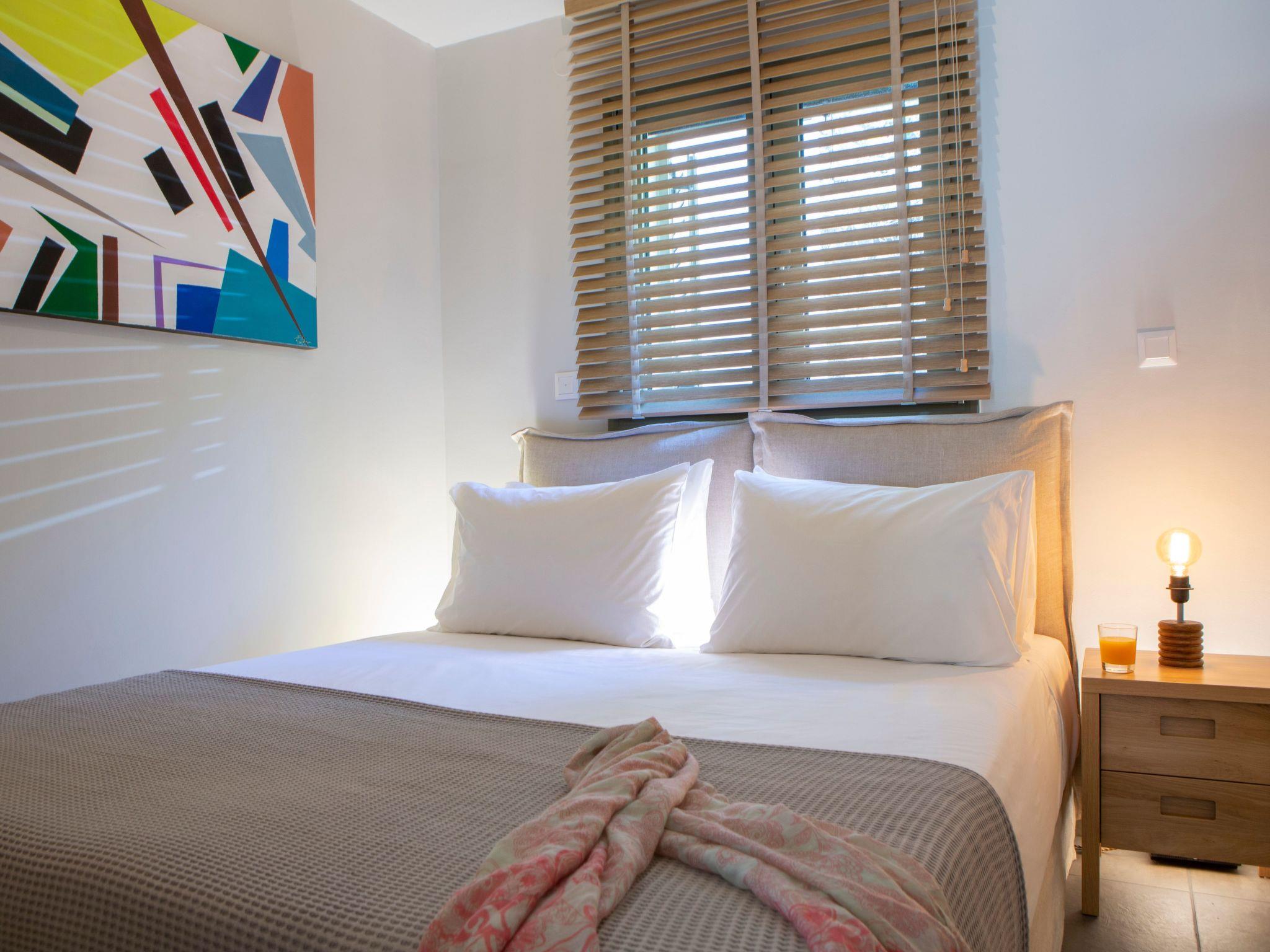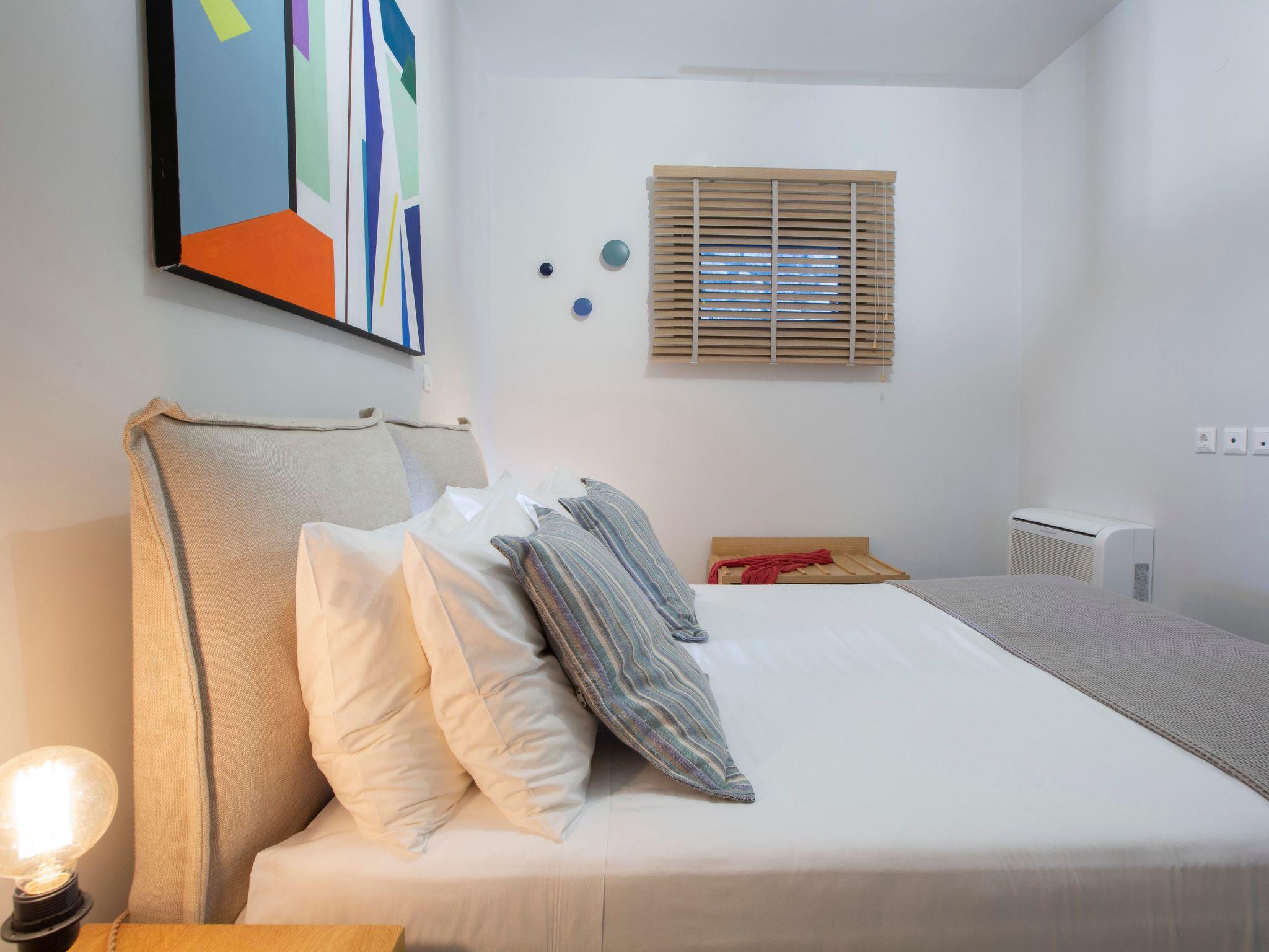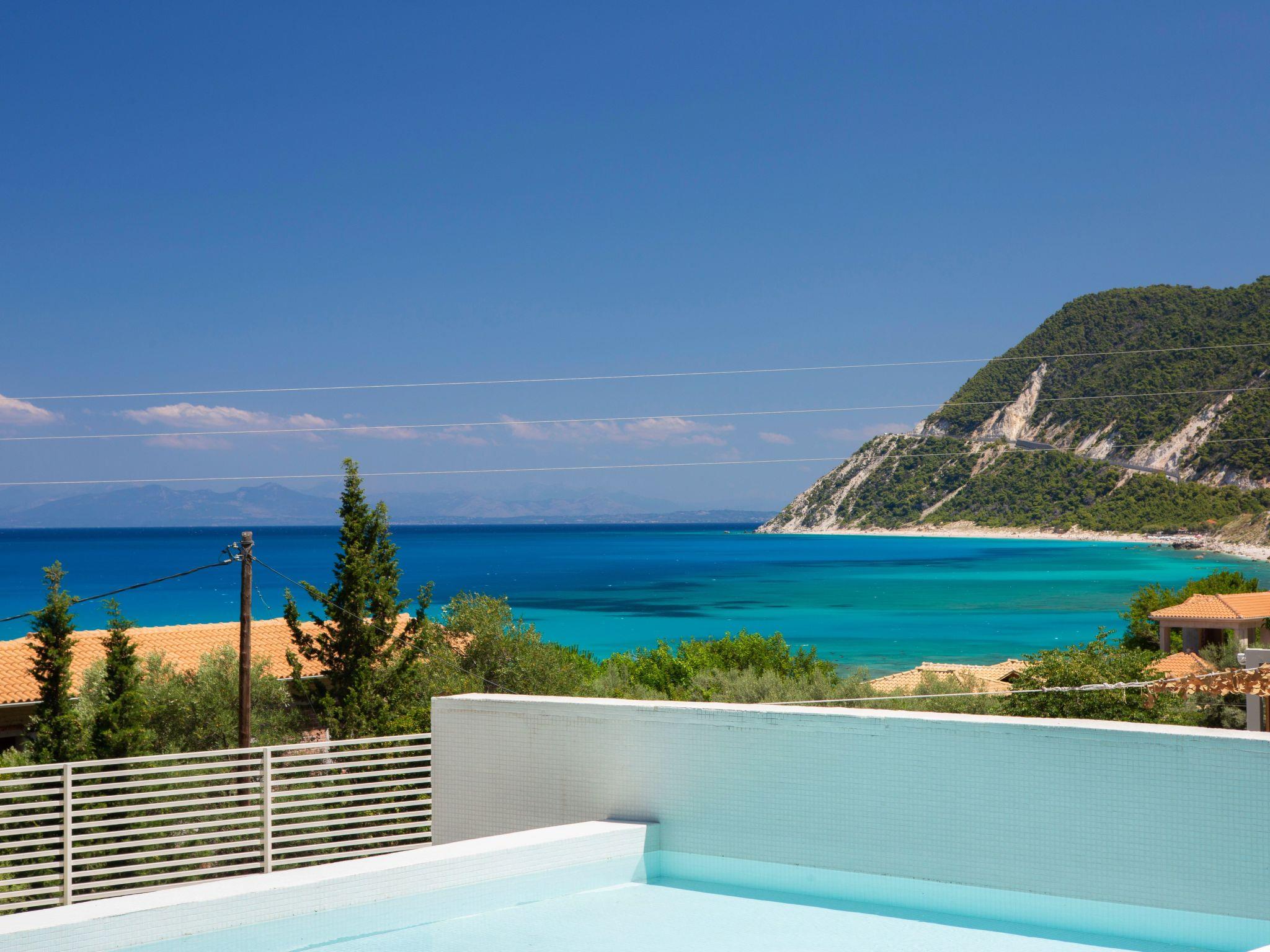 Ionian White villa has 5 bedrooms in total and can comfortably accommodate 9 guests and offers a folded extra bed for one more guest. The property is separated in two independent floors, allowing guests to enjoy privacy and seclusion. From the parking area, just few steps lead you to the swimming pool area with sunbeds and umbrellas that invite you to gaze at the endless blue Ionian sea and savor summer evenings. The stairs near the pool will lead you to the first floor of the villa that composes of a contemporary large kitchen with open layout, in contact with living room and dining area, plus one double bedroom with ensuite bathroom. Walking behind the dining area and few steps up is a second bedroom with double bed and ensuite bathroom.Outside the first floor, a large veranda with lovely sea views and an easy access to the swimming pool area is accessible through the front bedroom and living room, so you can enjoy the nice outdoor sitting area. From the beautiful outside space you can walk up the stairs to reach the second floor of the villa. Outside the entrance you find a large concrete summer living room, that will generously host you for your evening drinks. When entering the second floor, you see elegantly designed high ceilings, spacious open plan and wonderful natural sun light in the kitchen and living room, that will welcome you in. Through this large living room, connected to the wide kitchen and lovely dining area, you can access the spacious balcony with a panoramic view of the endless turquoise water of the west coast.On this floor are situated, one master bedroom in the front with access to the balcony, a bathroom with shower, and in the back one more room with 2 single beds, that can be easily converted to king size double bed with ensuite bathroom. Right beside this room, a small extra bedroom with one single bed is also an excellent option to sleep a child.